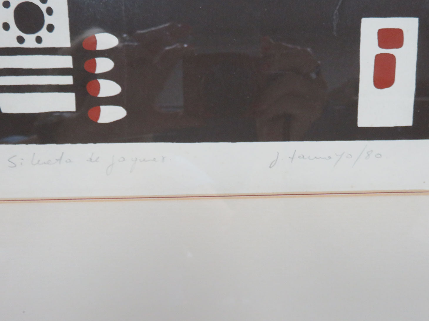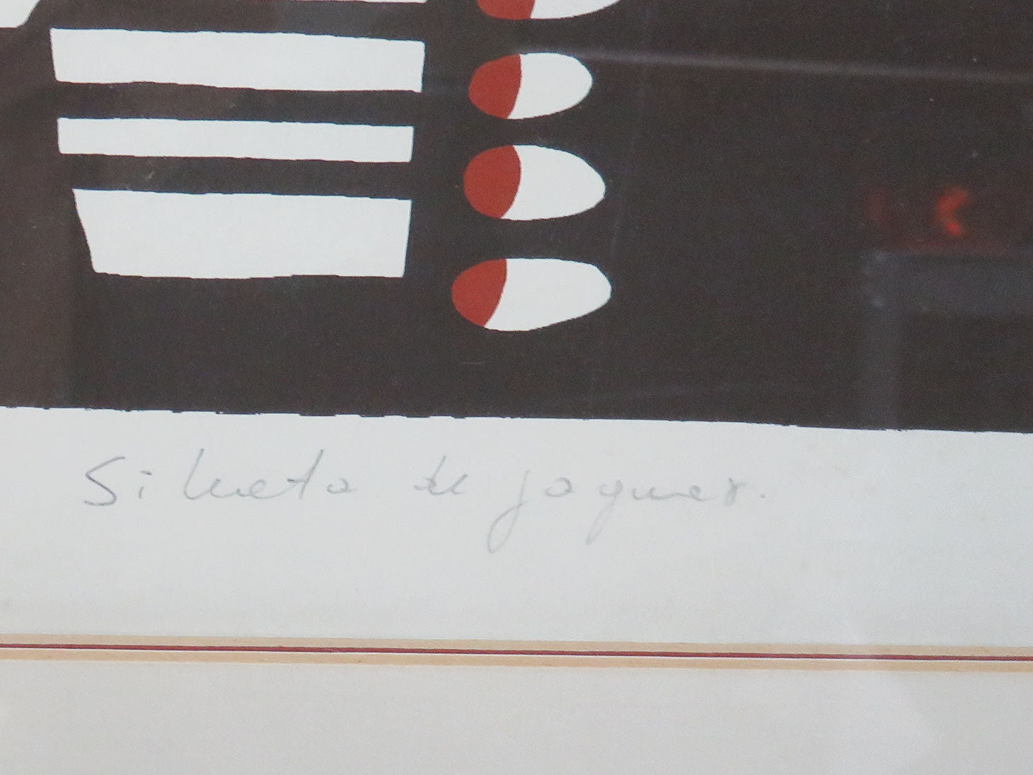 "Silueta de joques" (Silhouette of Joques) 70/80, by Native Woodland Indian artist, brown, rust, cream figure.