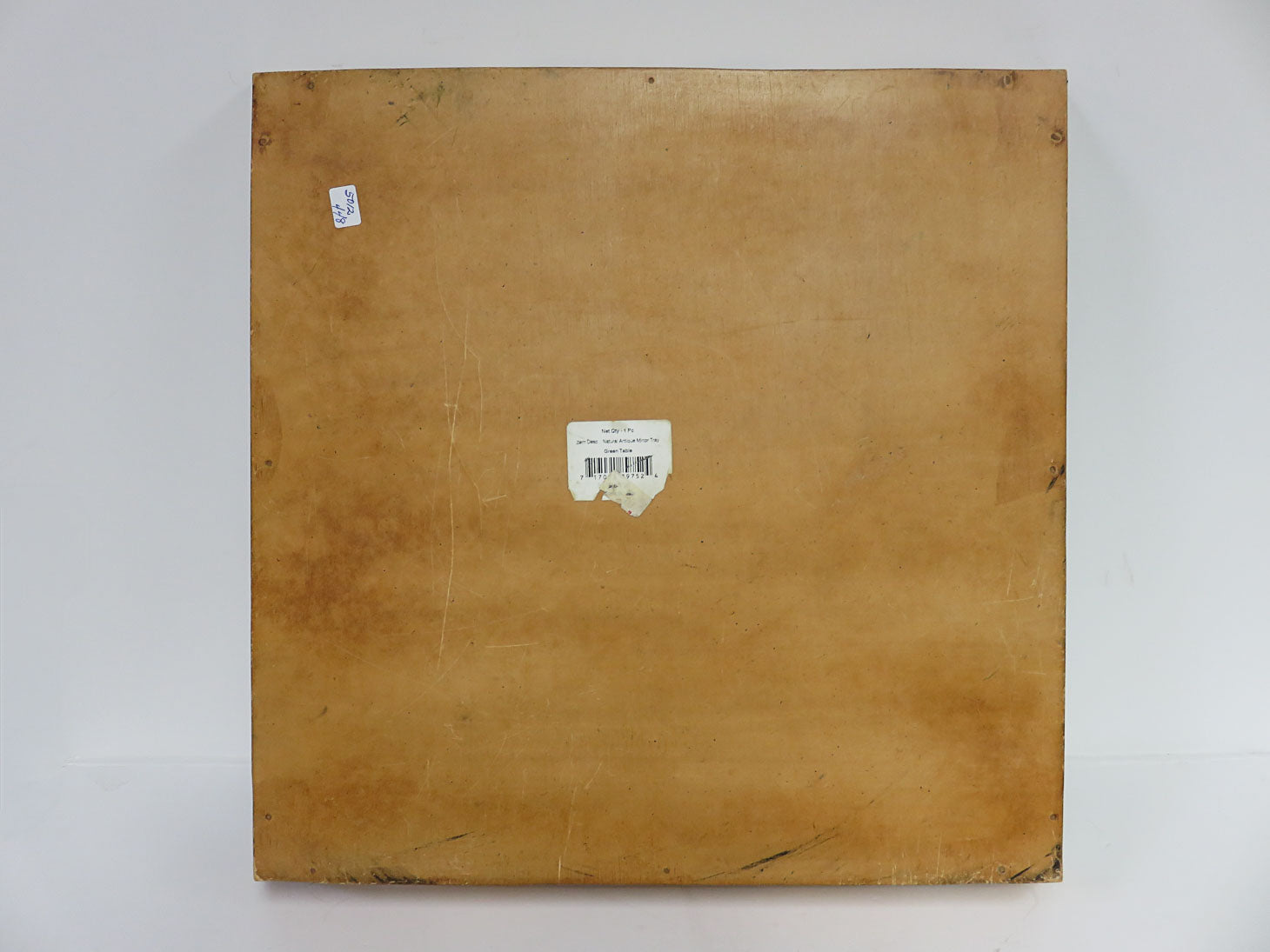 Scalloped wood rim and two cut out handles. Leopard print mirror. Some scratches on mirror.