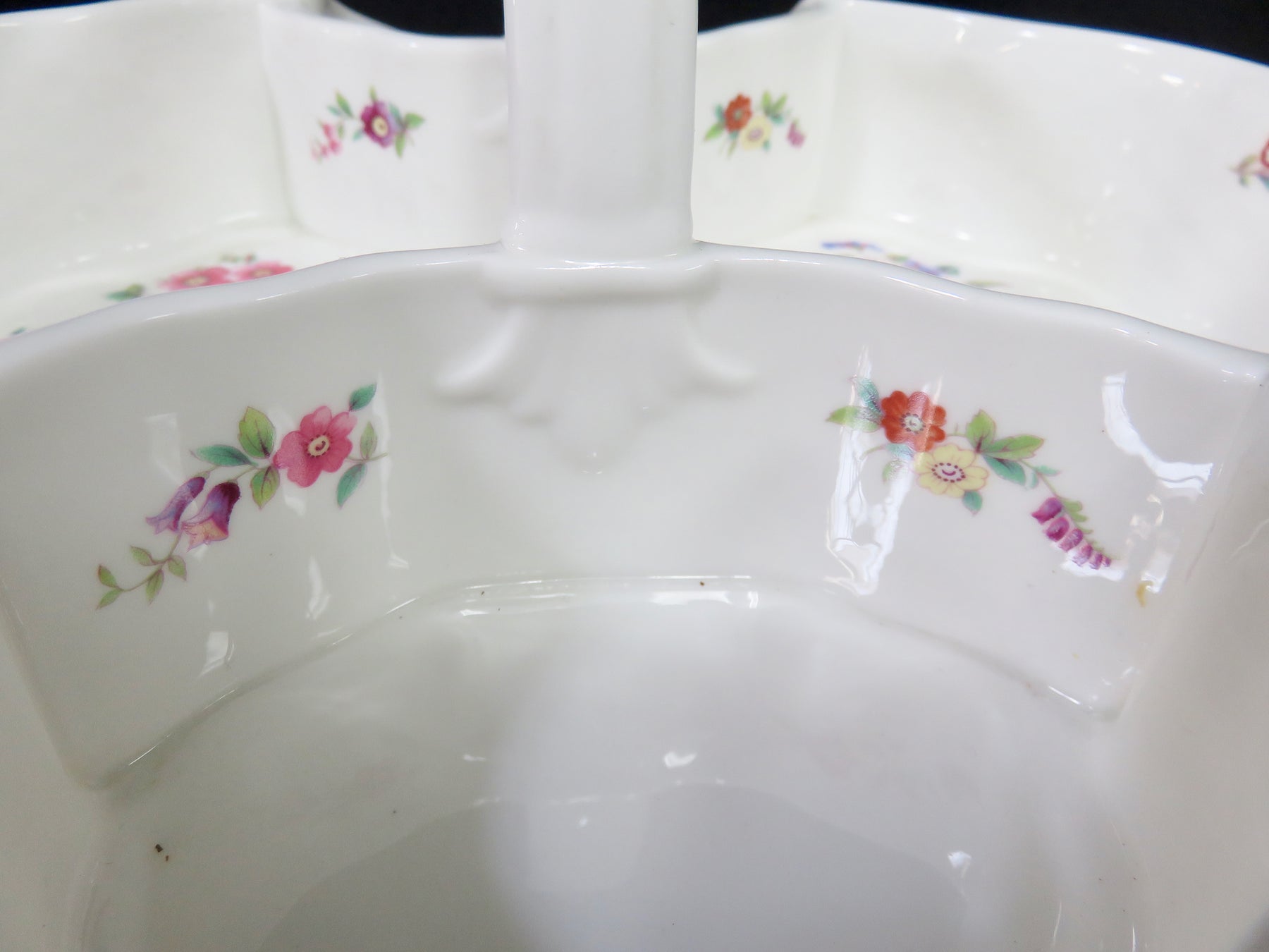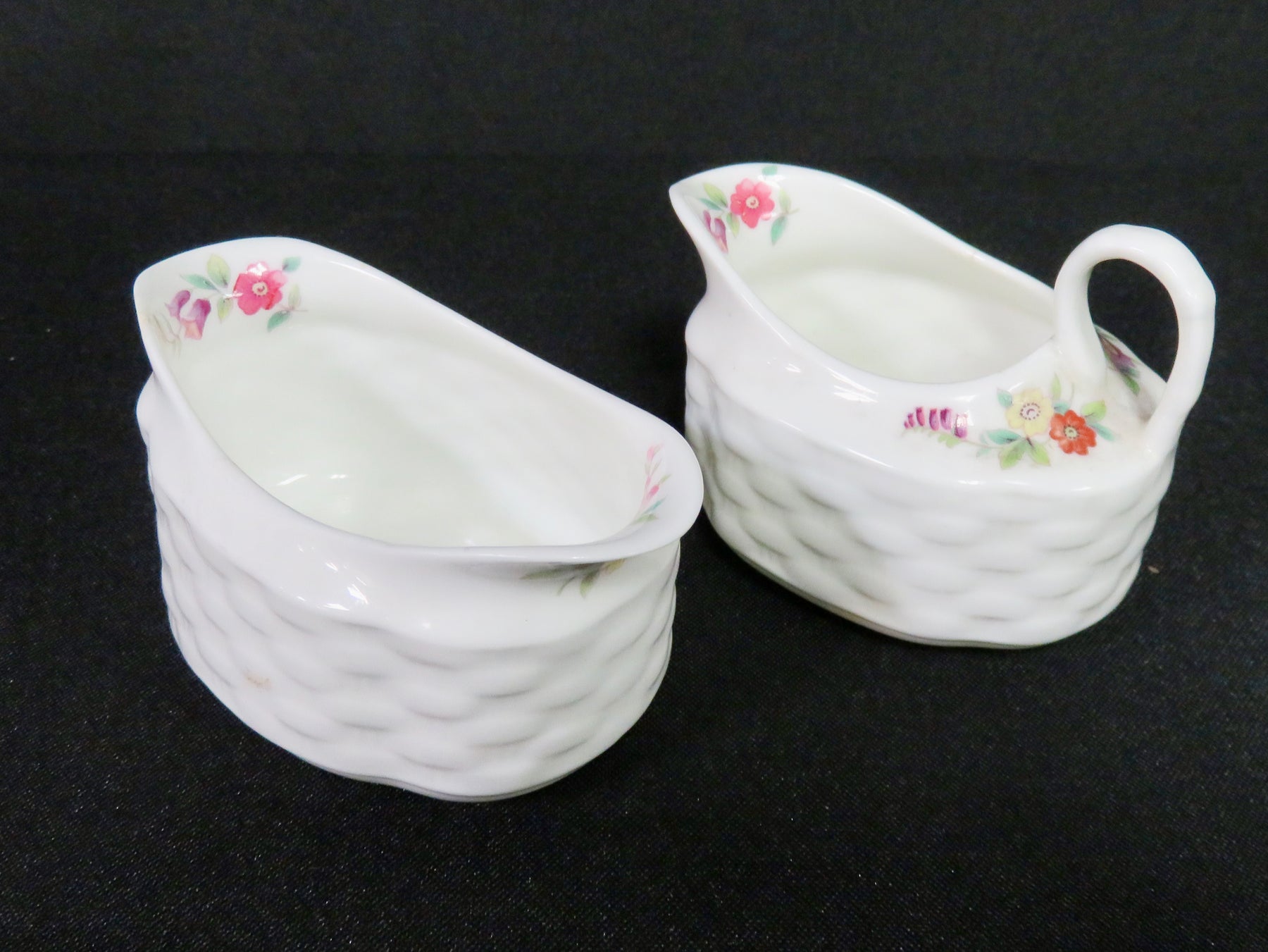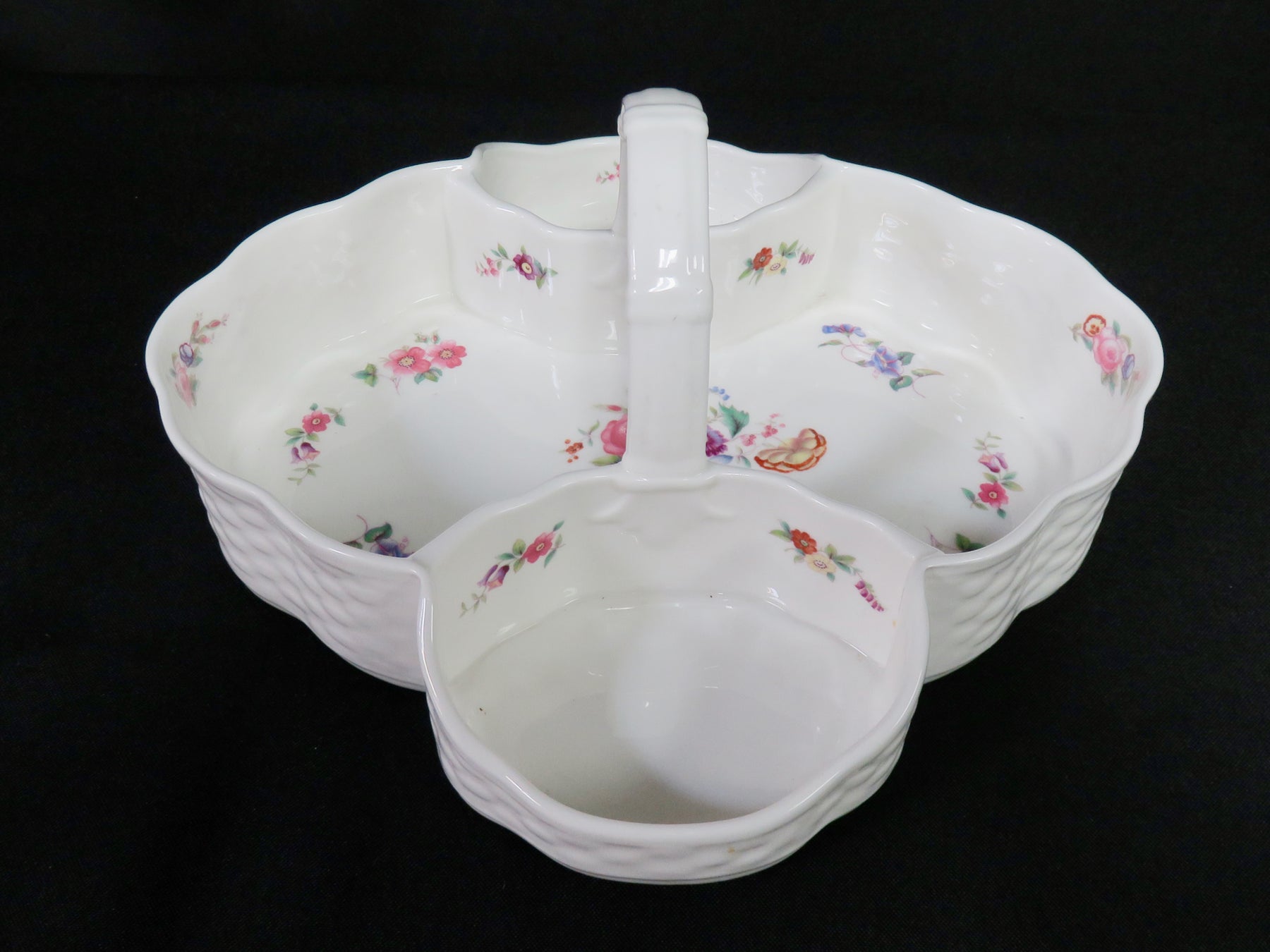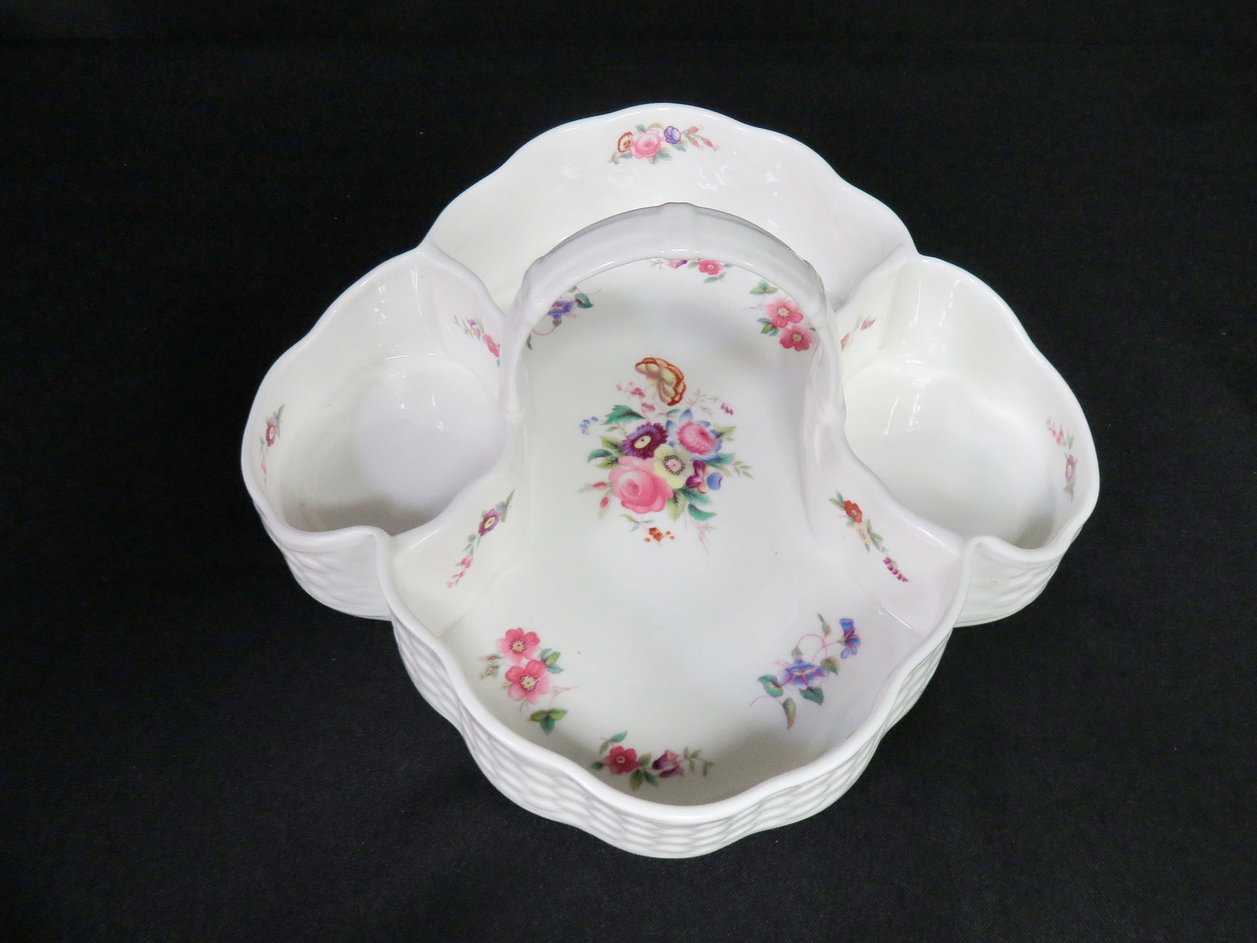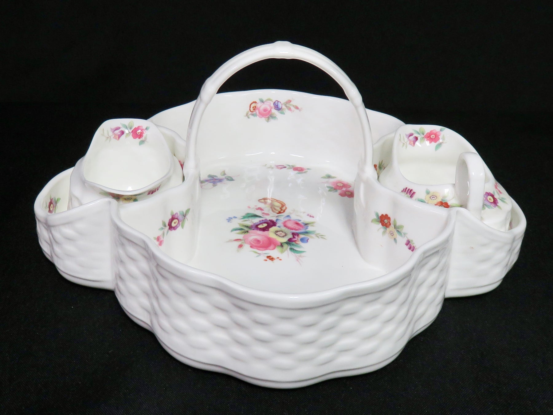 Item Number: 13397-41 Strawberry Basket, white with floral design, basket weave, 3 sections with handle, creamer, sugar (3 pcs) 10" x 9.5" x 5"