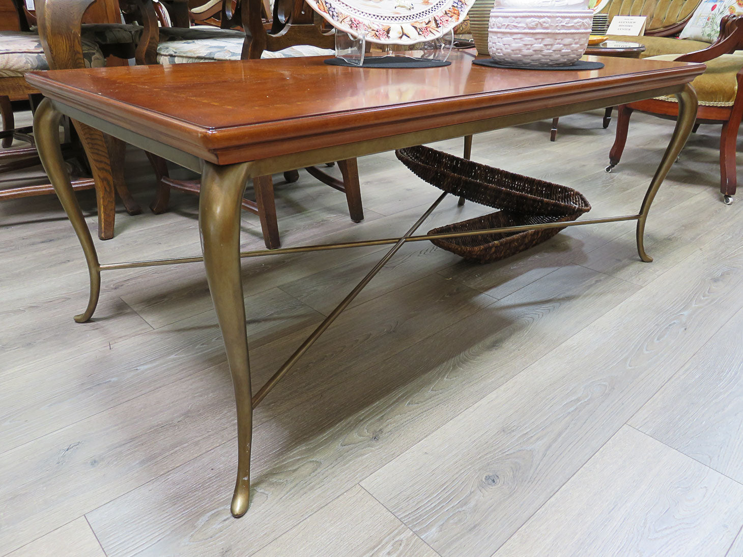 Book matched pattern surrounded by inlaid trim on wood top. Bronzed finish to cabriole legs and stretchers.