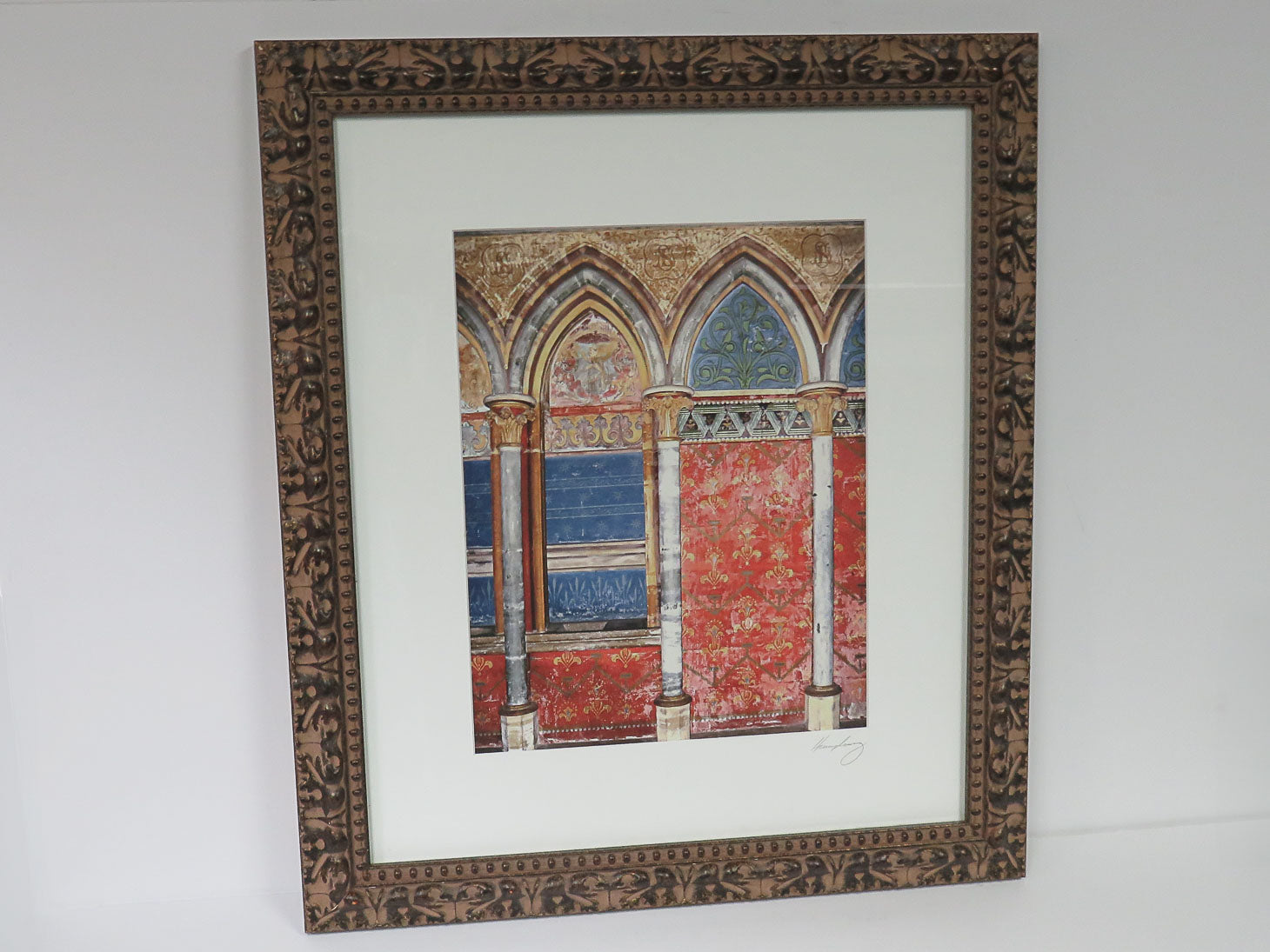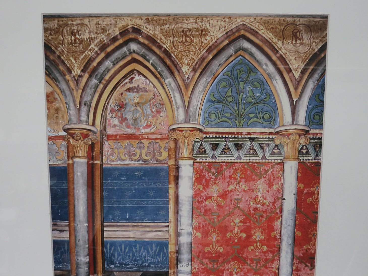 Arches with fleur de lis detail on walls, muted blues and reds