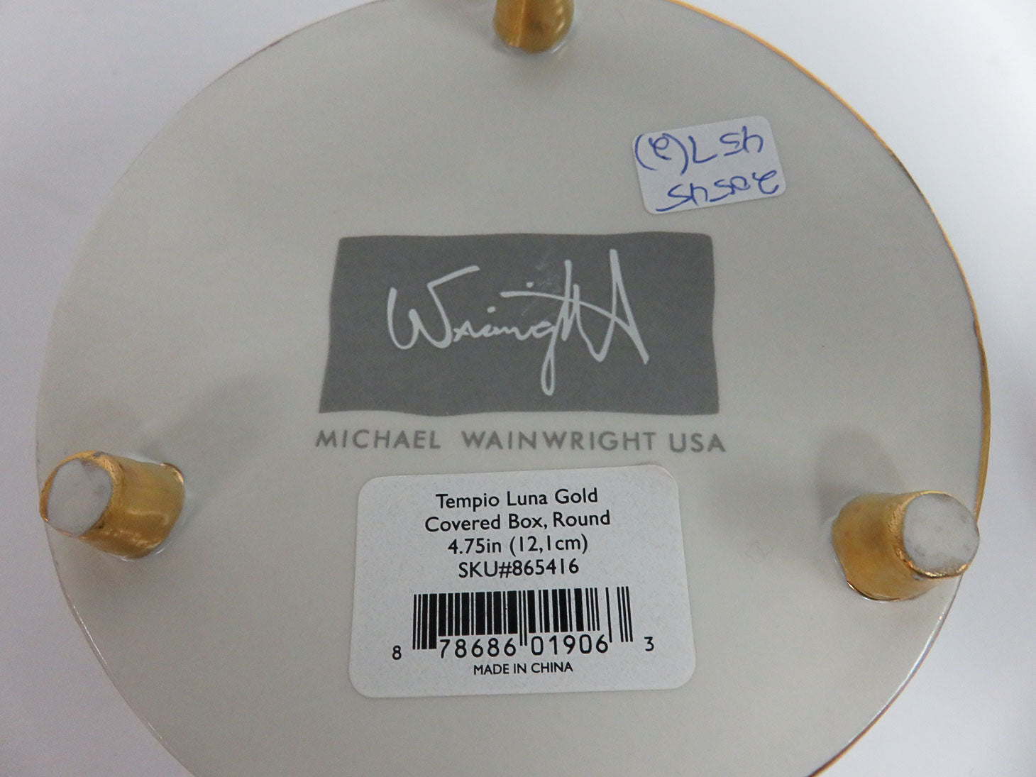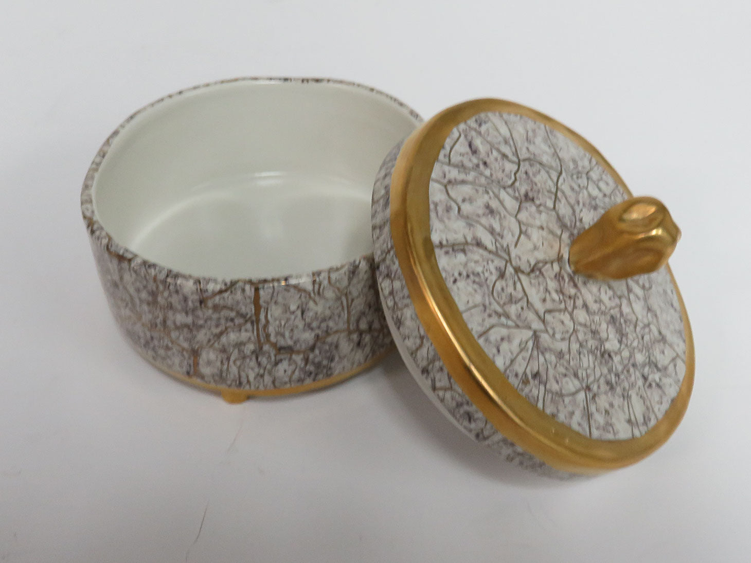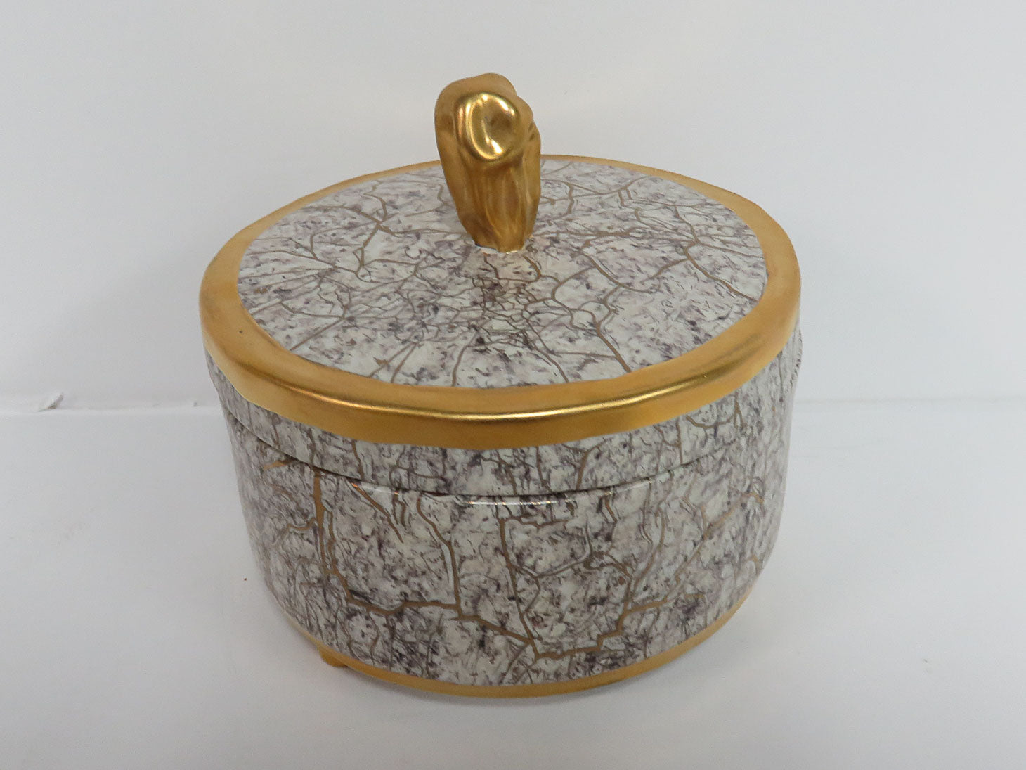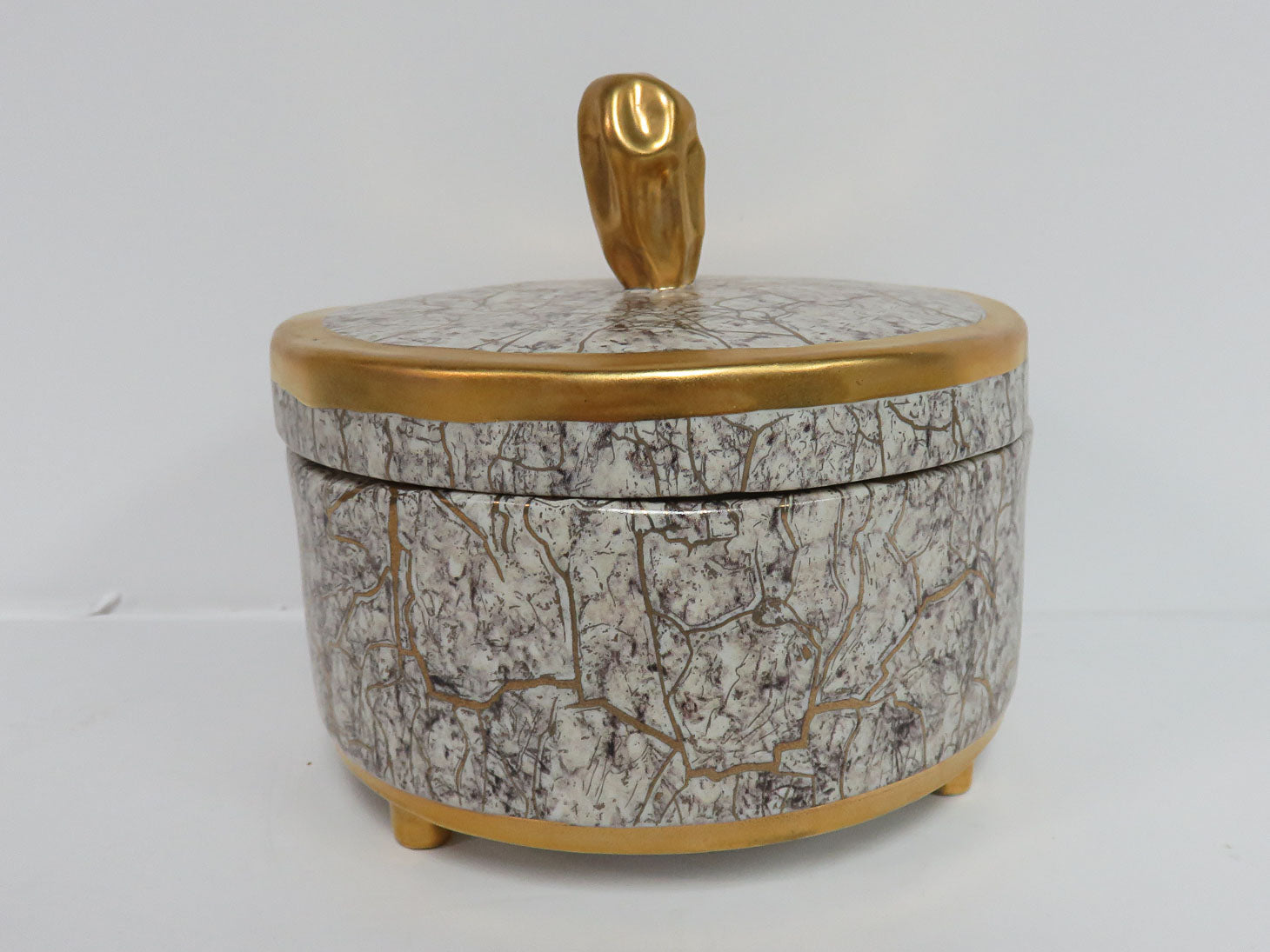 "Tempio Luna Gold" covered trinket box. Gold veined look over white with gilded details.