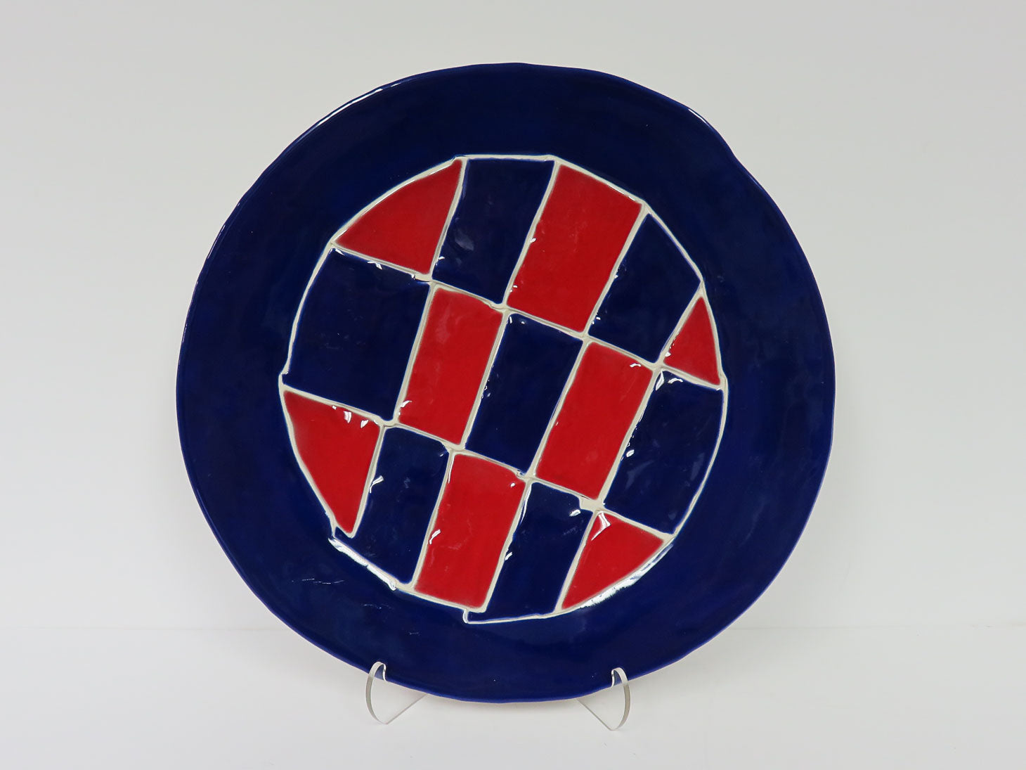 Woven red and blue center, blue exterior band, can be wall mounted,