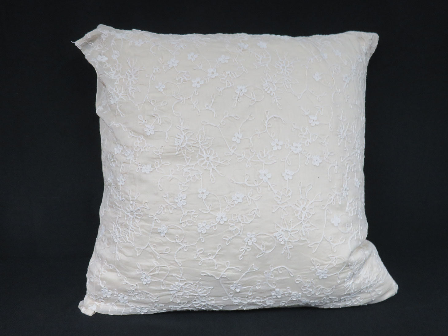 Item Number: 18424-113 Cream colored with white embroidered floral design and ribbon closure, feather filled. Two available. Sold Separately. #18424-114. 24" x 24" H