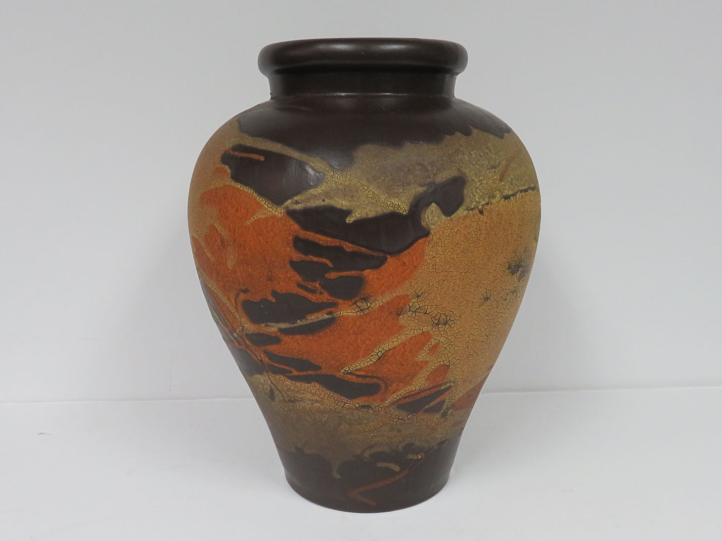 Earth toned urn-shape with flared rim. Brown, orange and yellow
