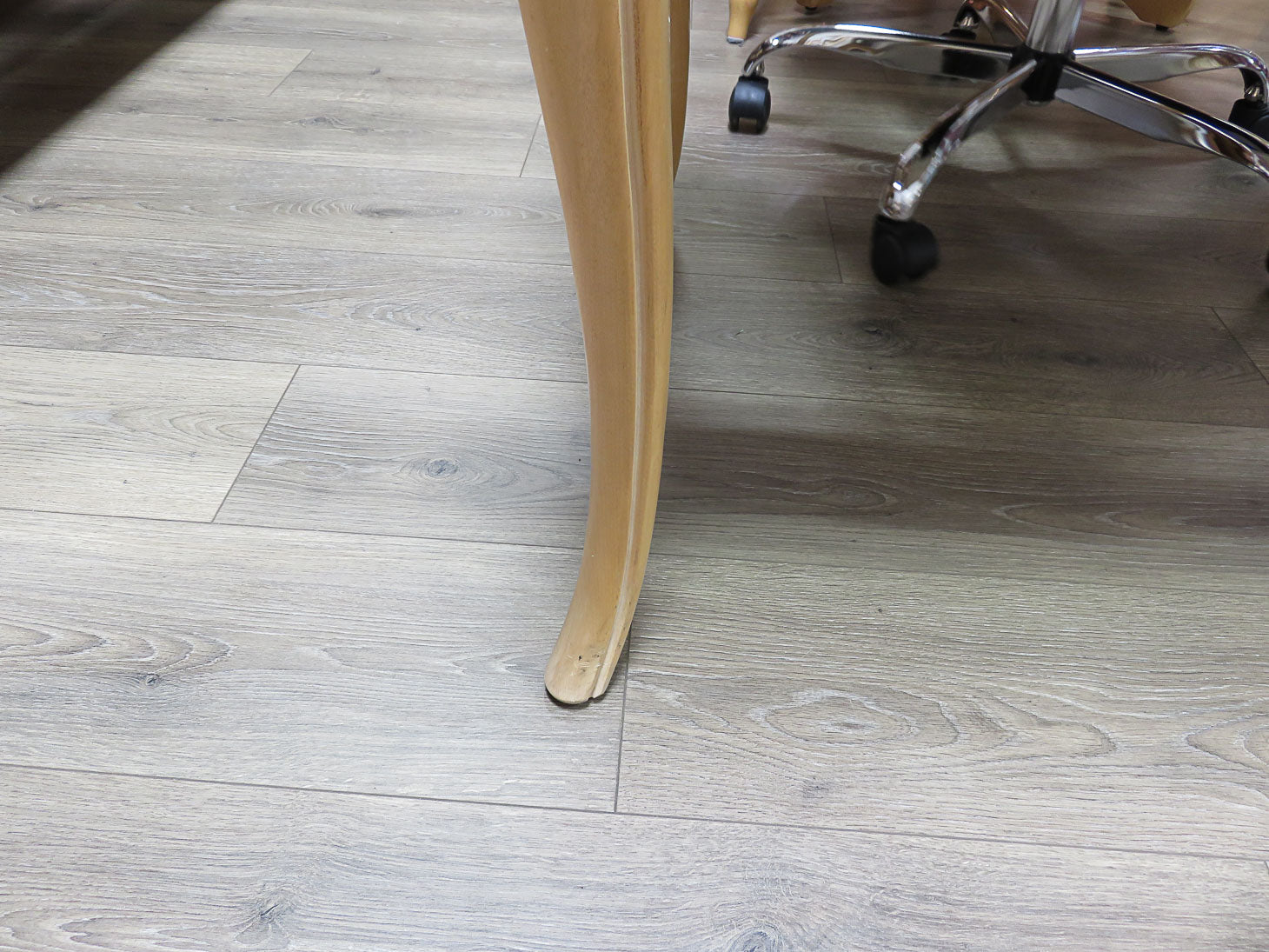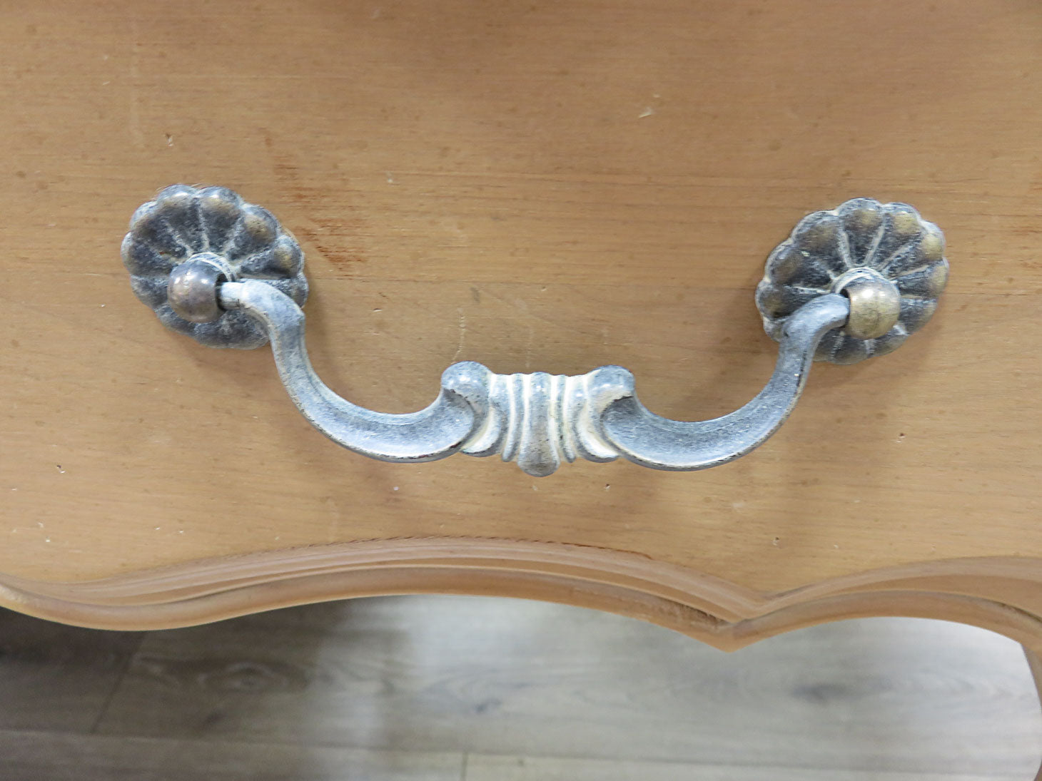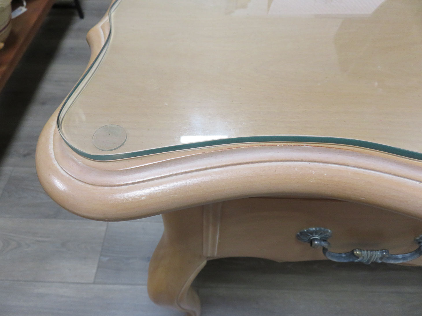 Blonde wood writing desk, 3 drawers and scalloped edge to top and protective glass.