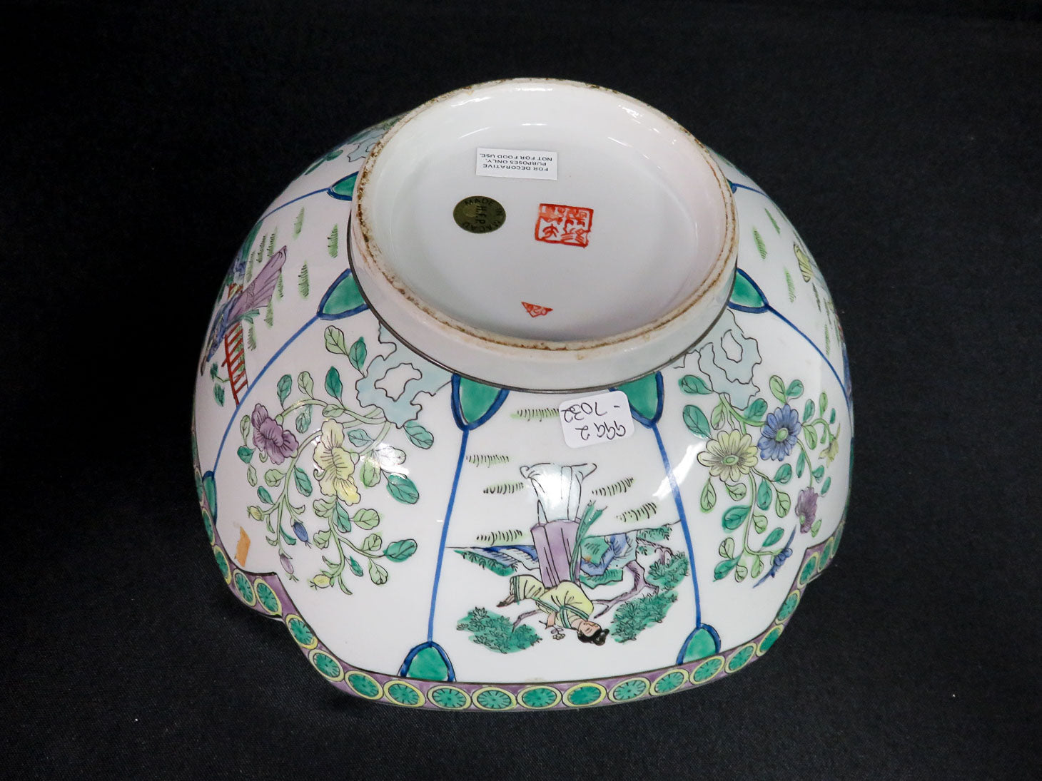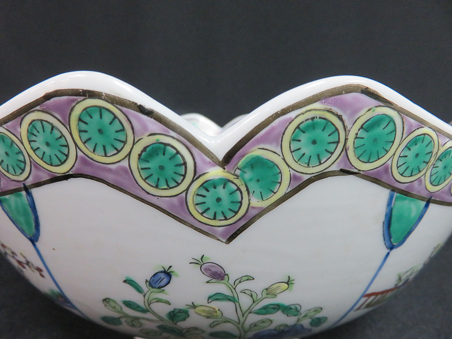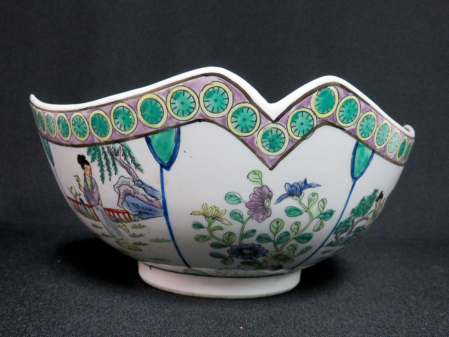 Hand painted panel design with floral and courtyard scenes. Scalloped edge.