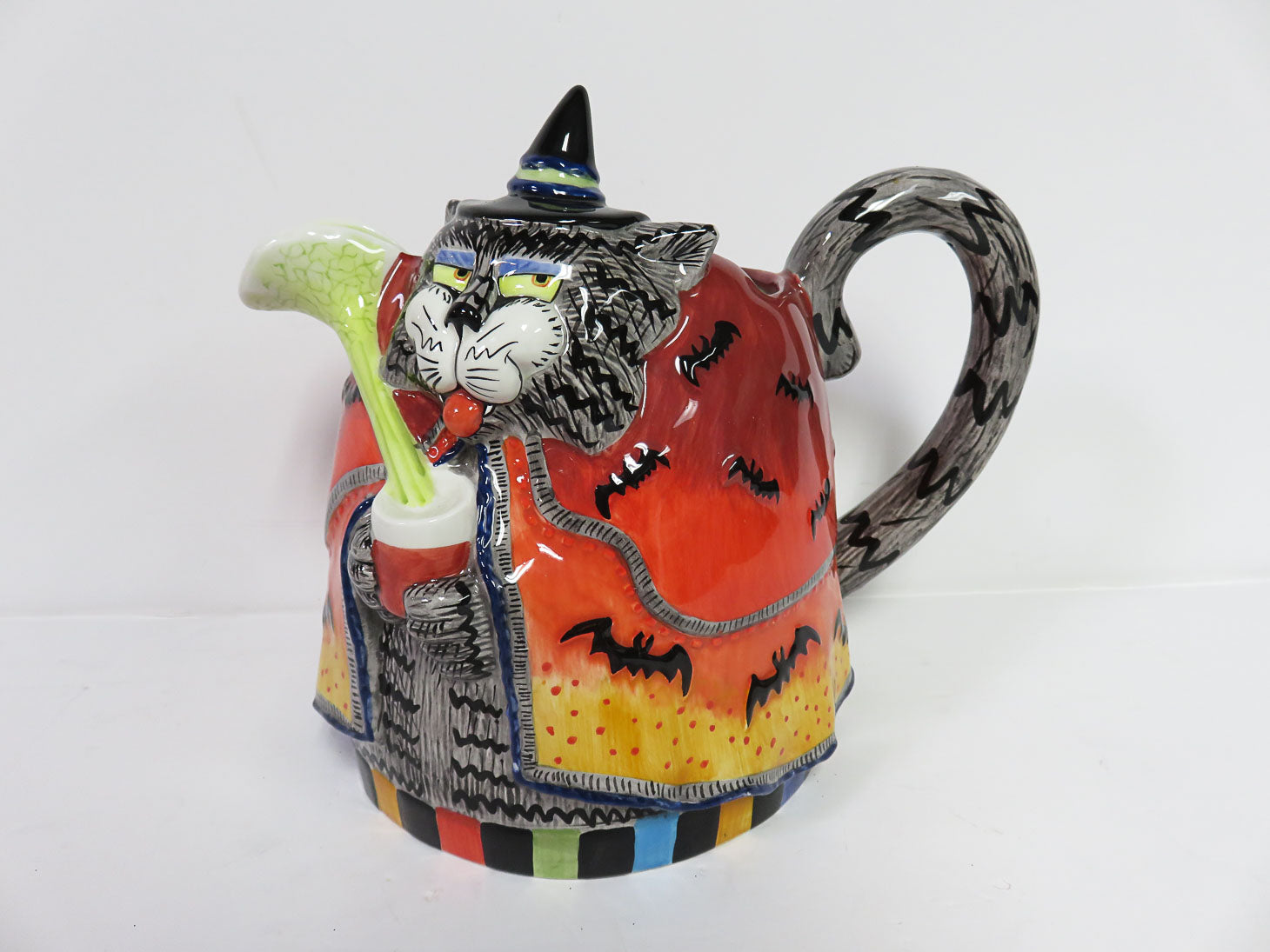 Hand painted molded pitcher of Kitty holding a cup of brew.