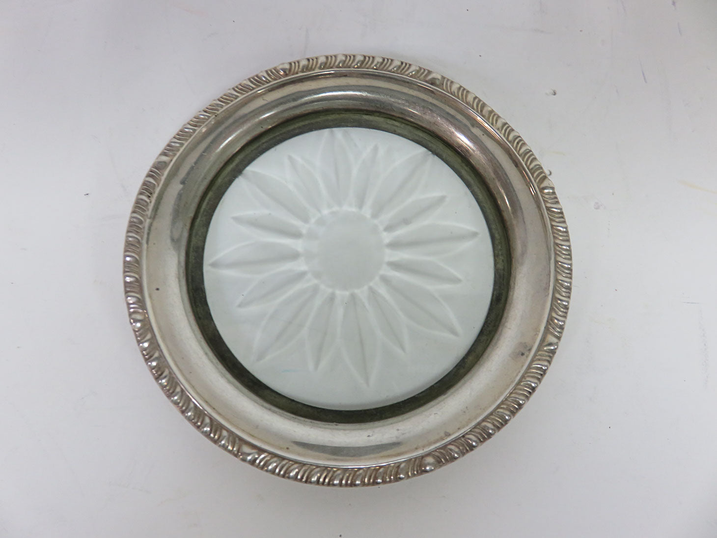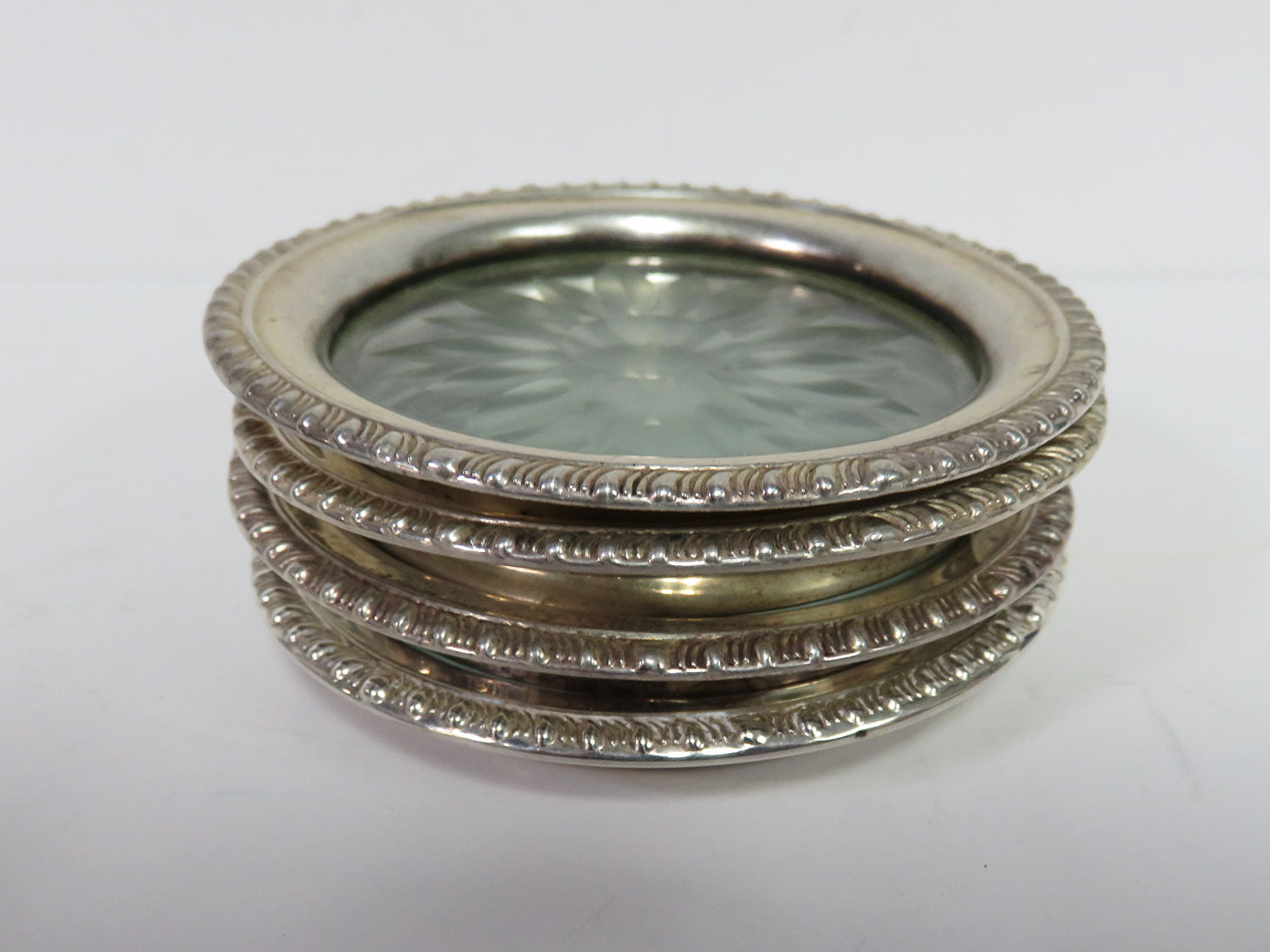 Item Number: 9992-6492 Set of 4, Sterling edged coaster with an embossed edge. A glass center has frosted glass floral design. Two sets available. Sold separately. #9992-6491. 3.75"W