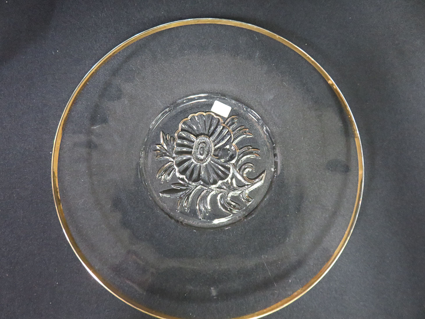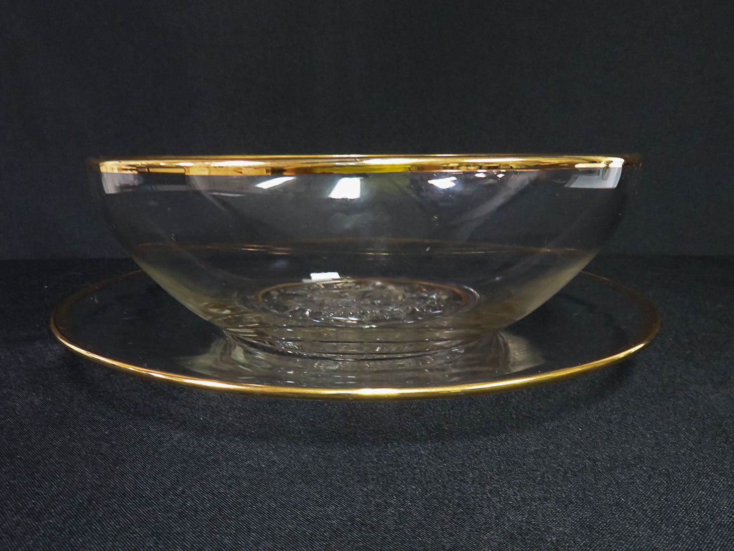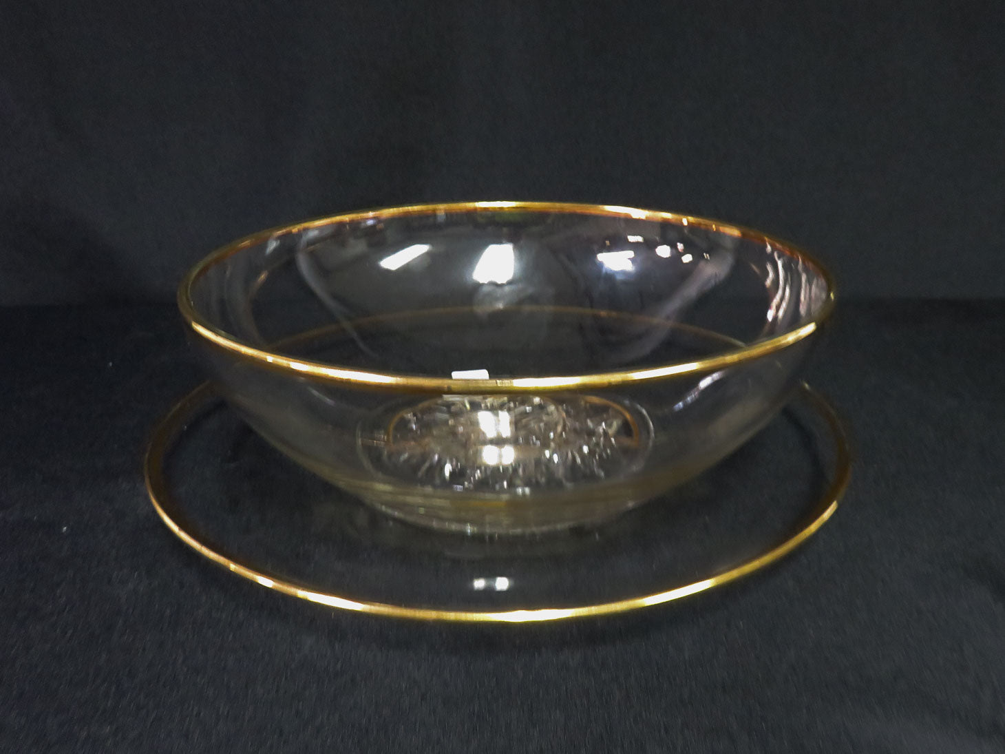 "It's Dilly" cear bowl and platter with gold trim, floral bases. Two pieces.
