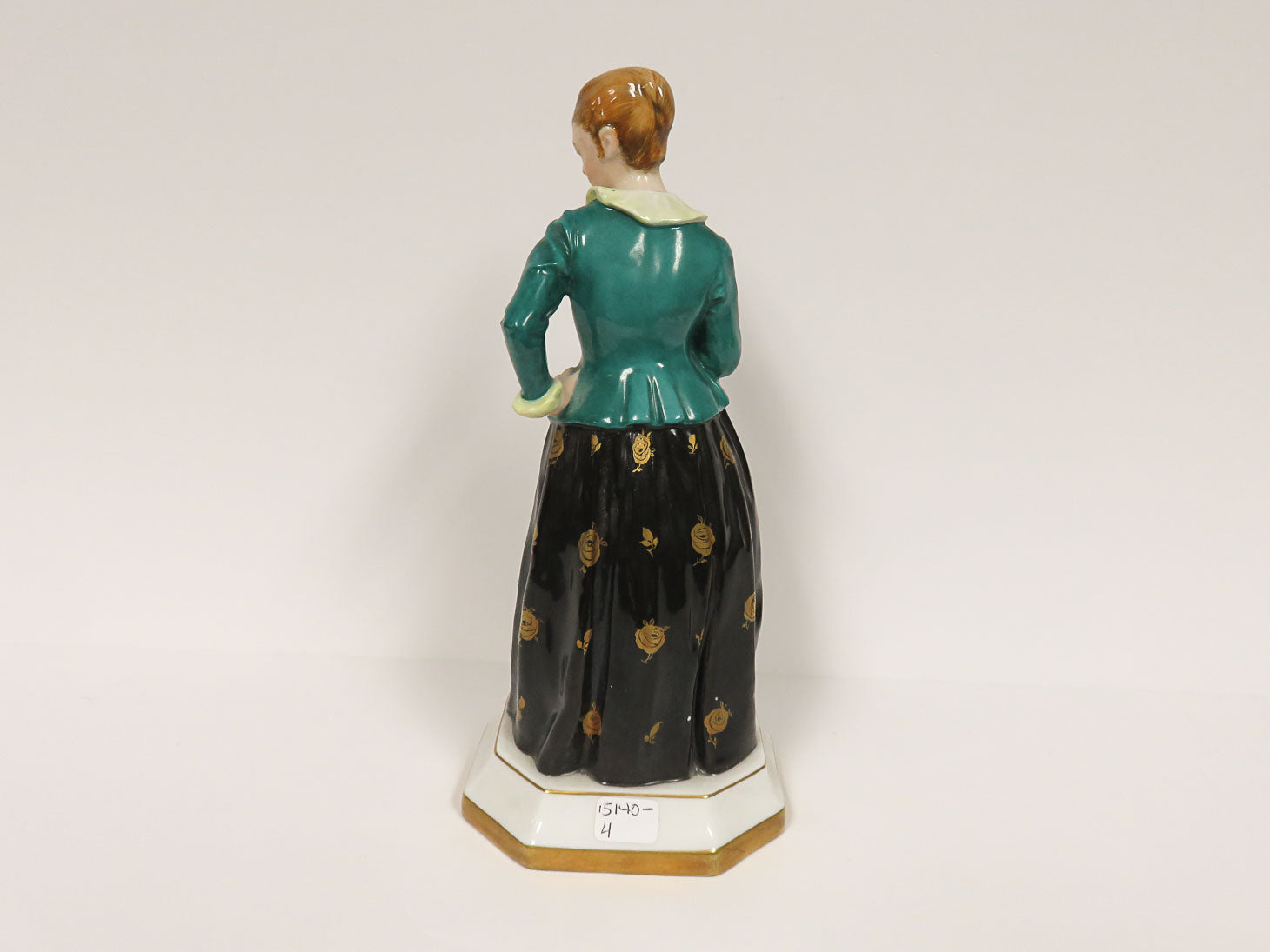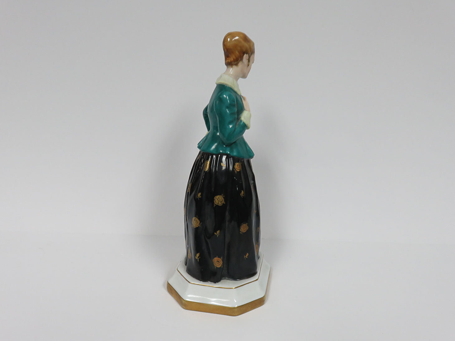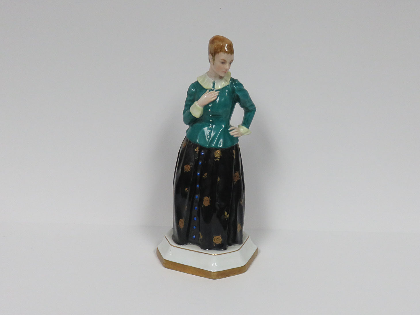 Woman in teal jacket, full black skirt with gold roses, A Gebhardt, 1918