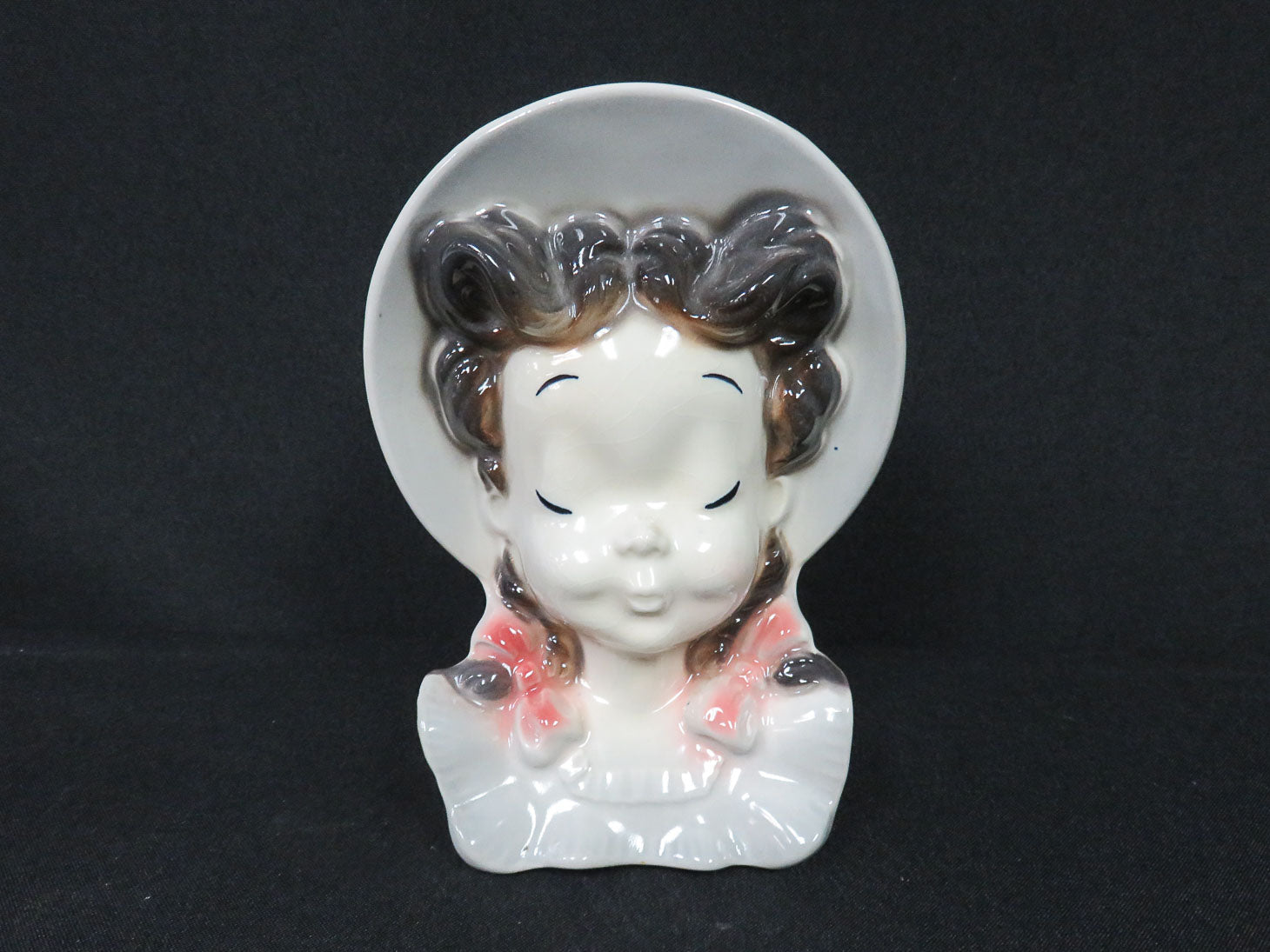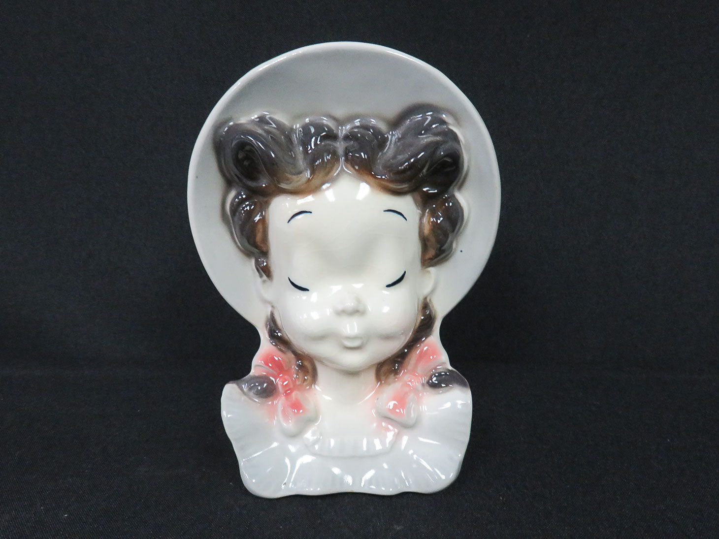 "Pigtail Girl" with brown hair, pink ribbons and sun bonnet.