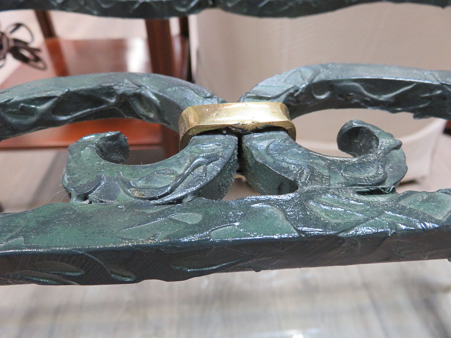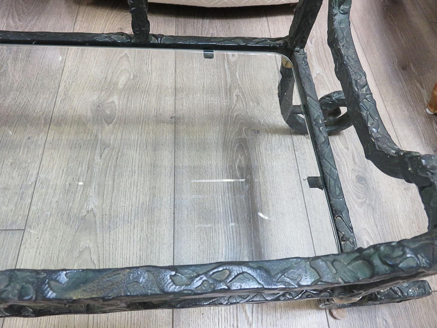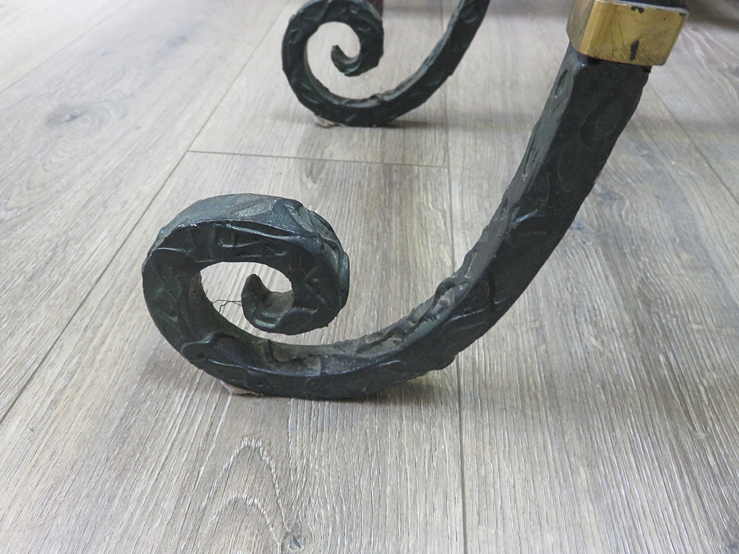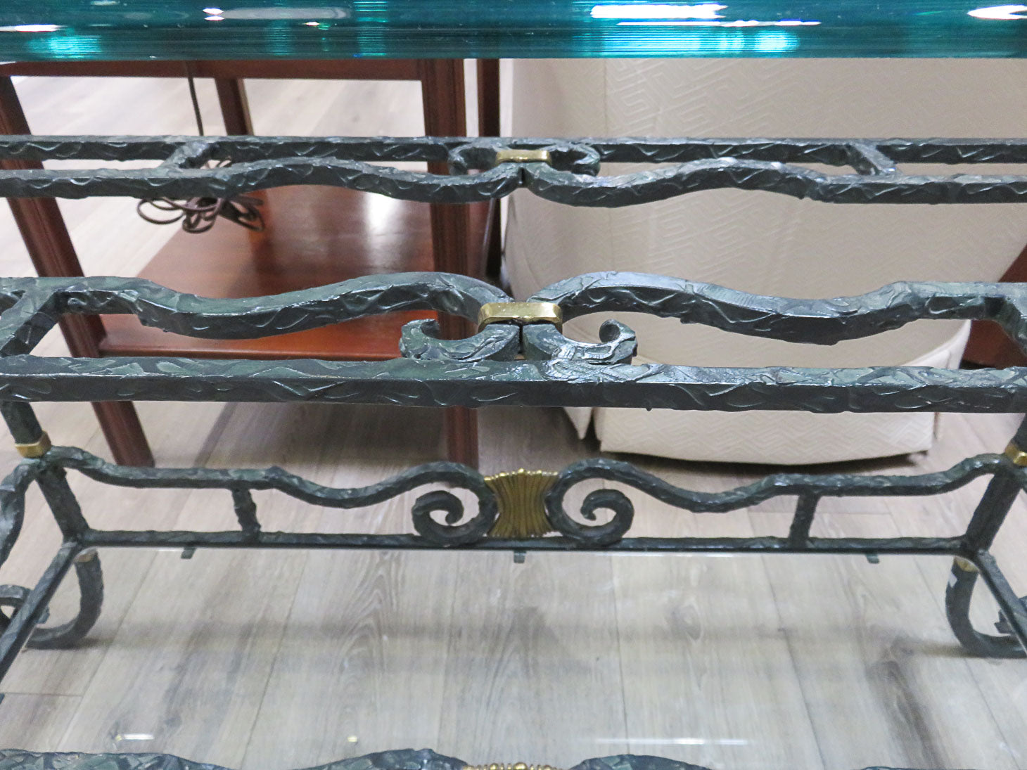 Scrolled wrought iron frame with a textured finish and brass detail. Beveled glass top and a lower glass display shelf.