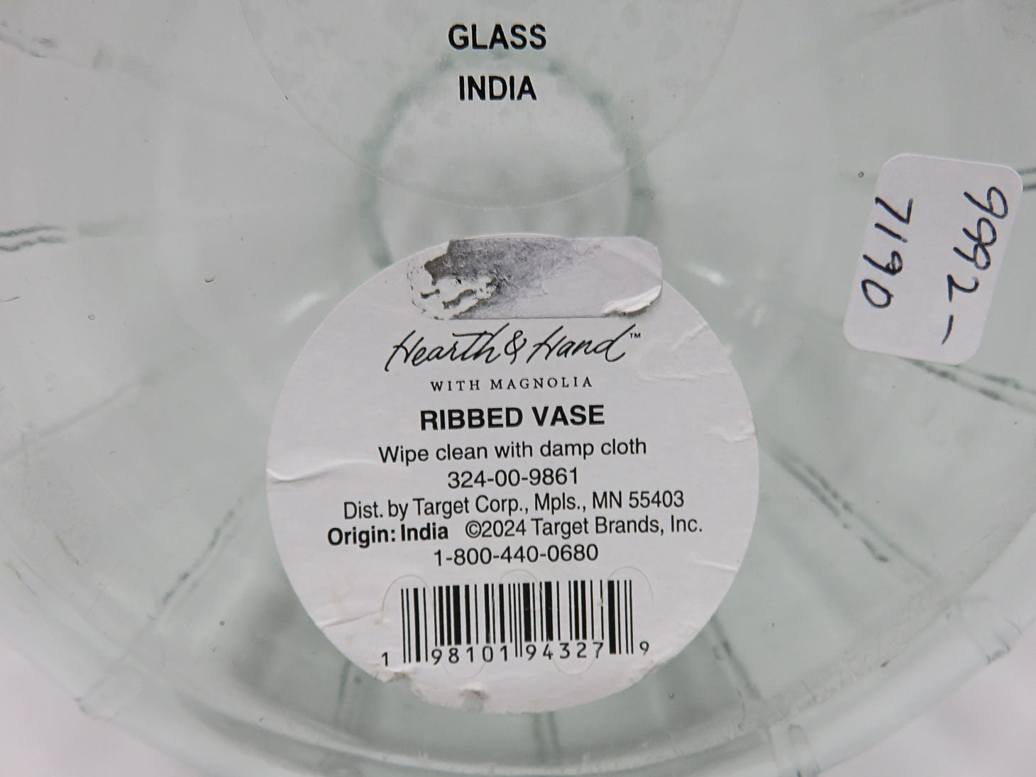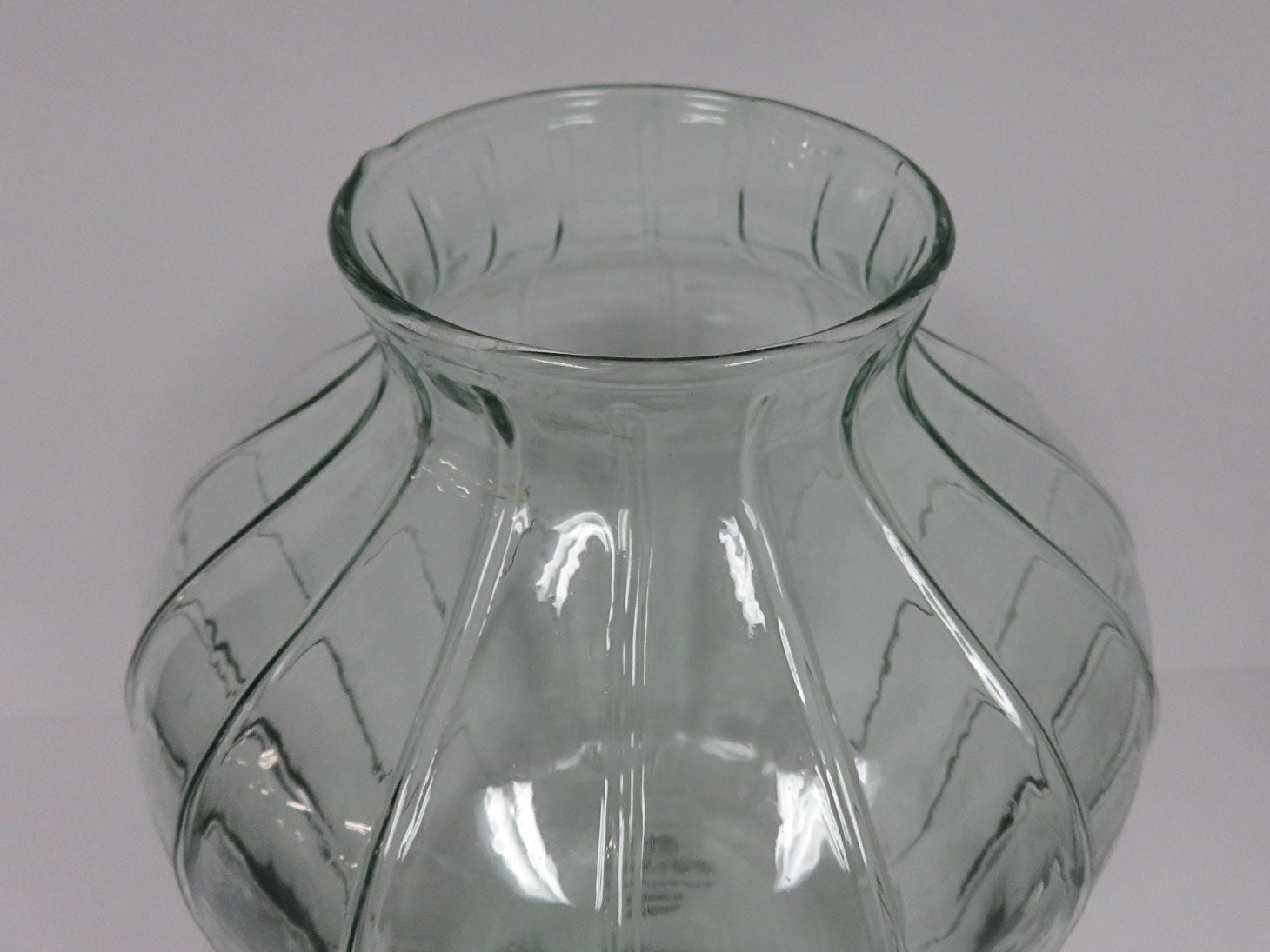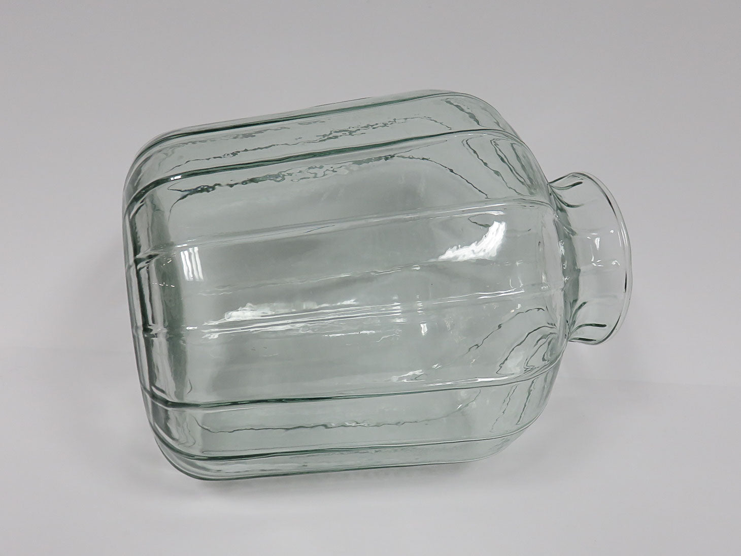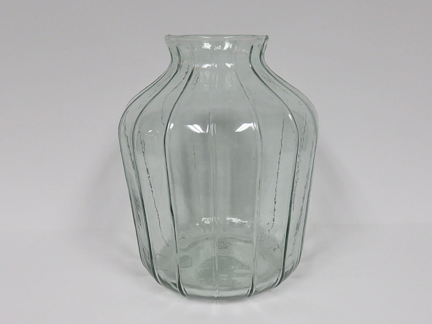 Jug shaped, clear with slight green tint, ribbed, narrow neck