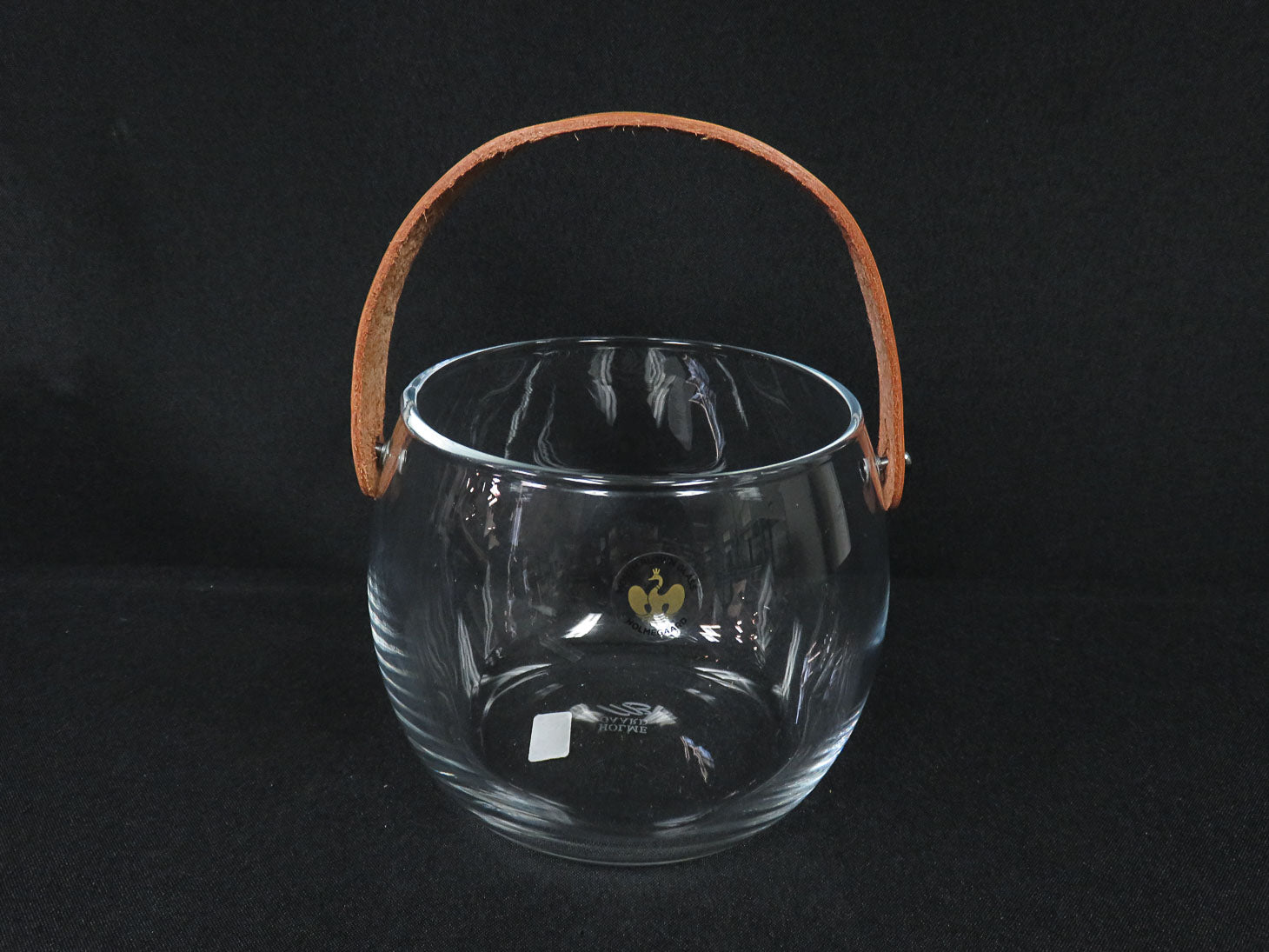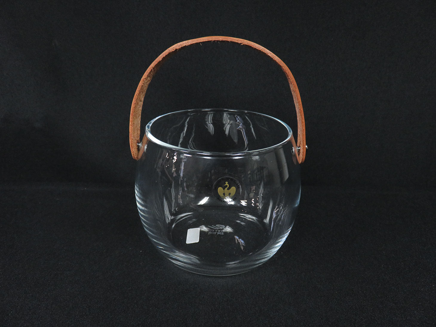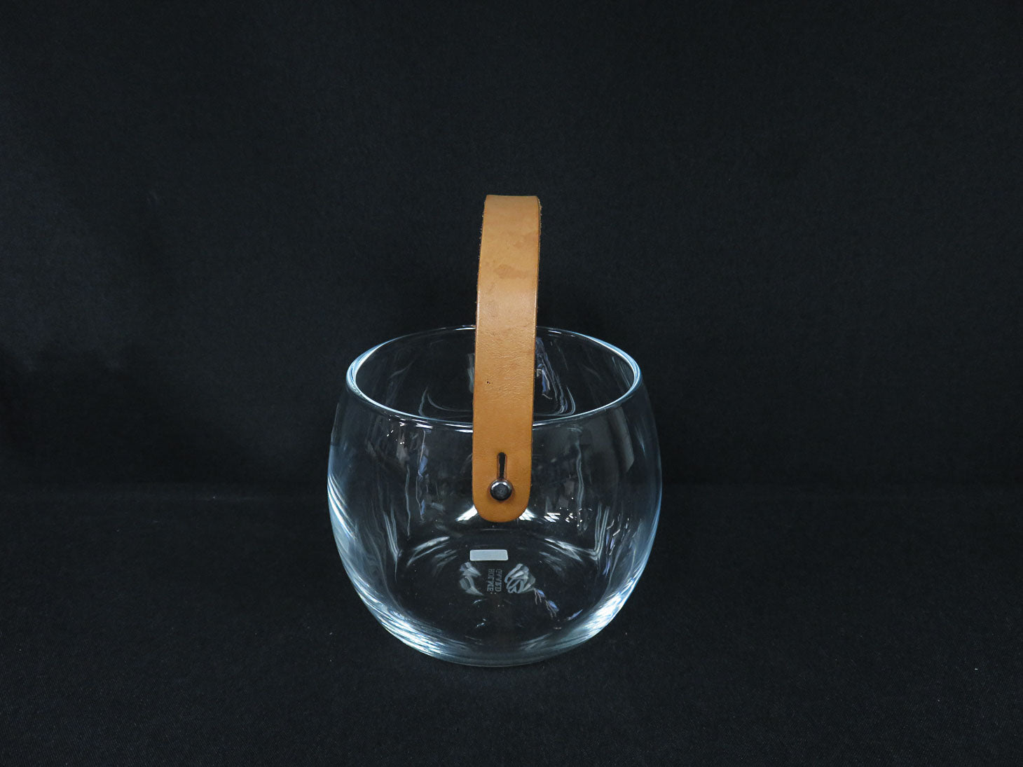 Clear with leather strap handle, etched stamp