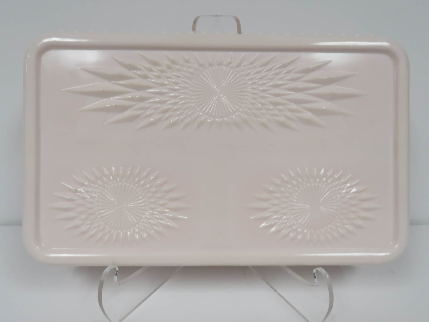 "Shell Pink", beaded edge and embossed feather and starburst pattern.