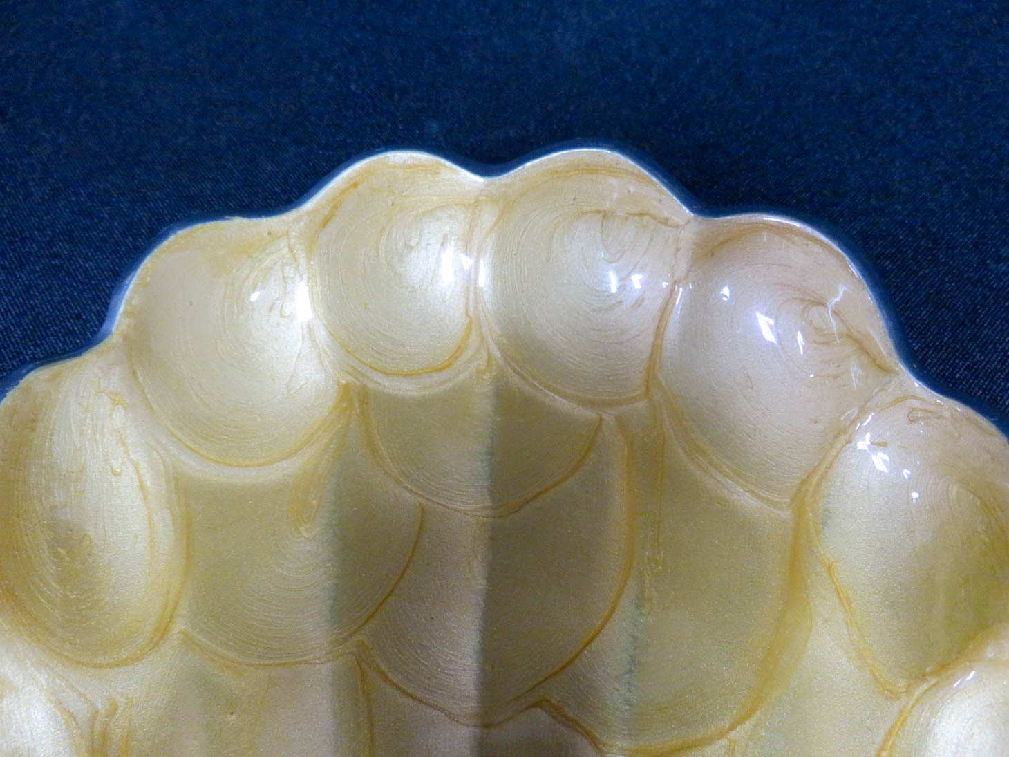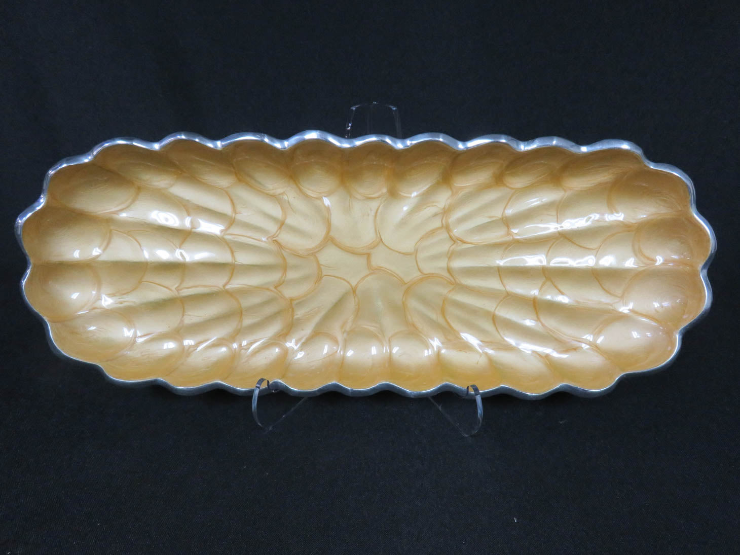 Rectangular, with scalloped edge, silver base, sand color interior. 14" x 5.25" x 1"