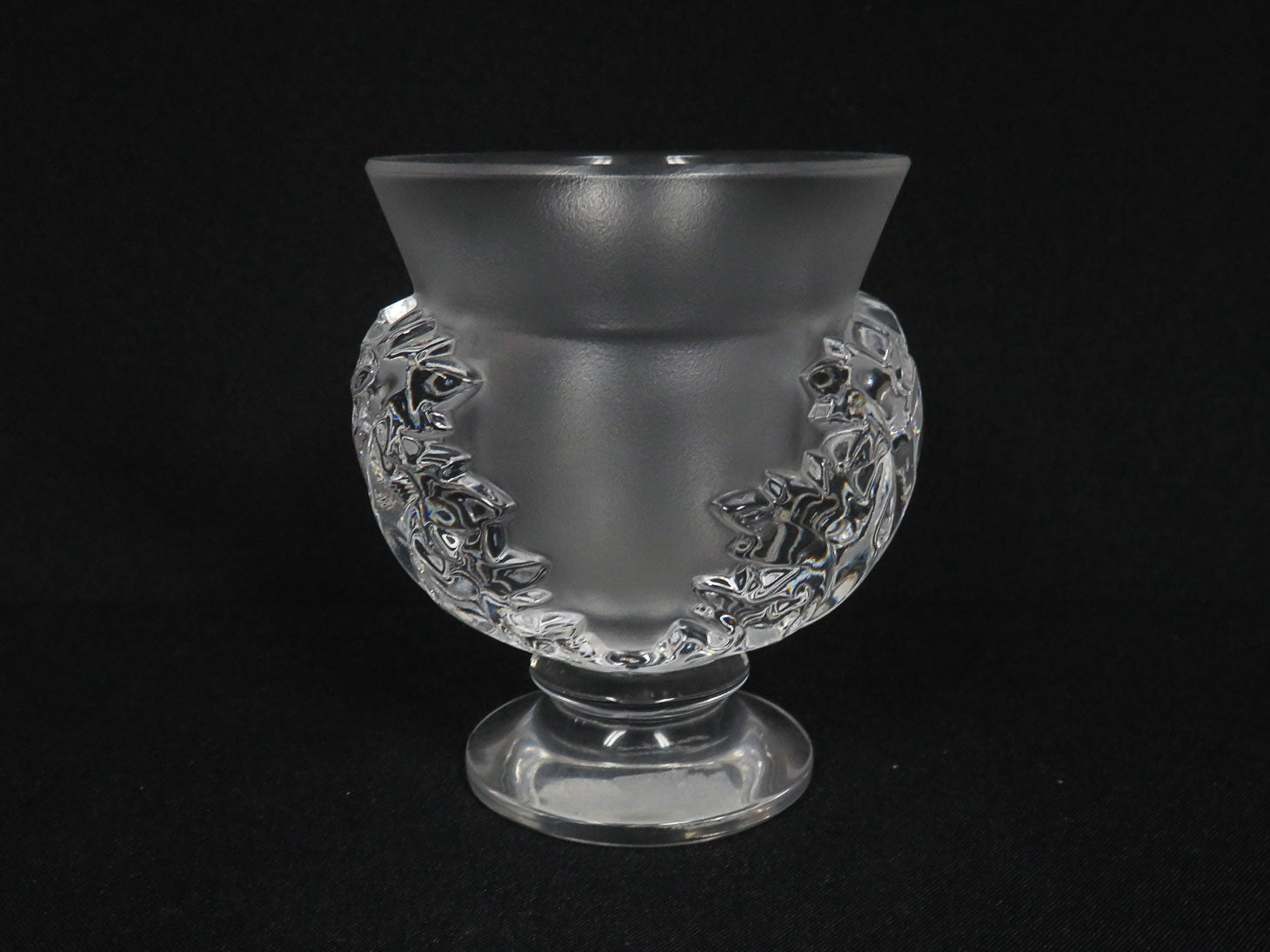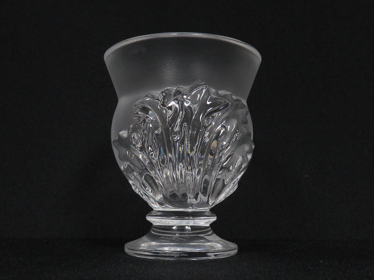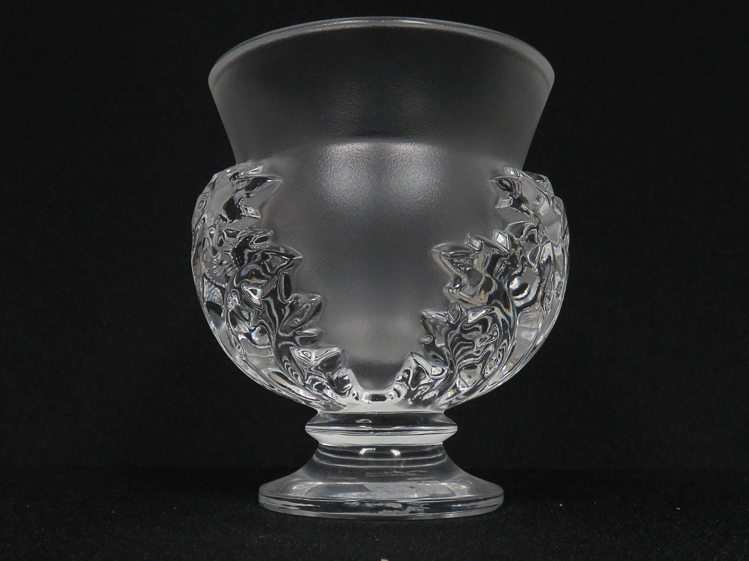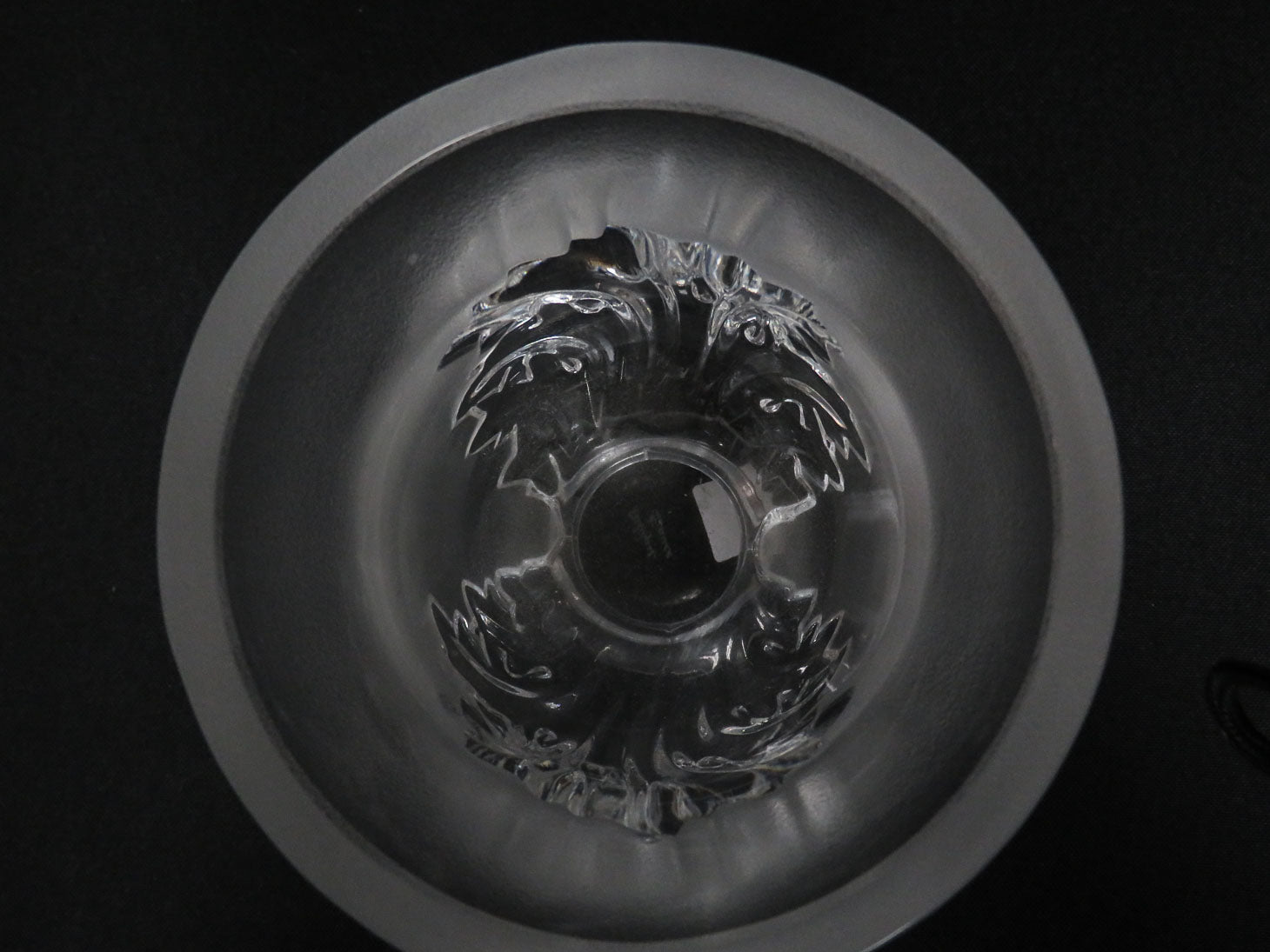 Frosted satin with clear acanthus leaves on pedestal base. Discontinued.