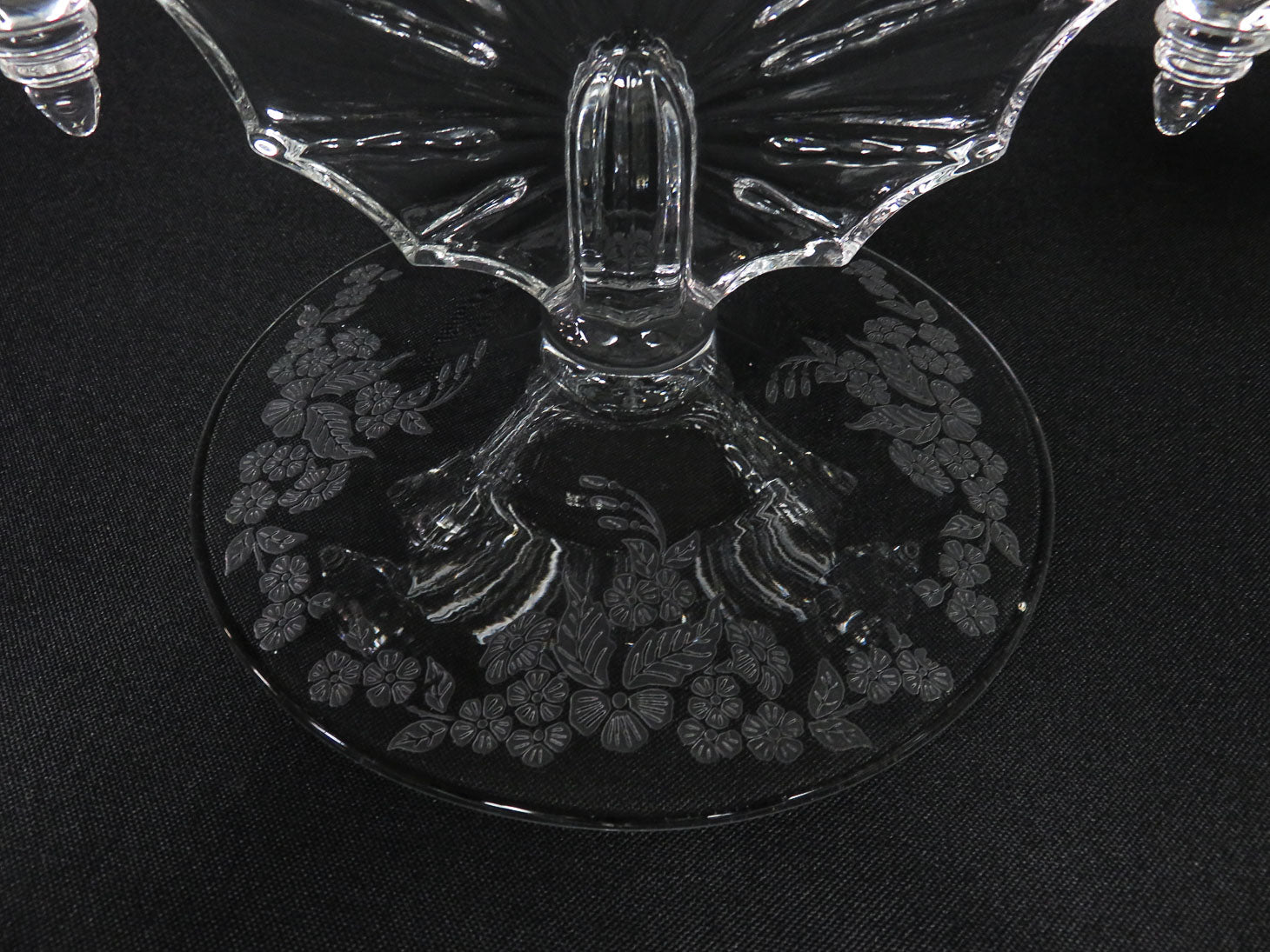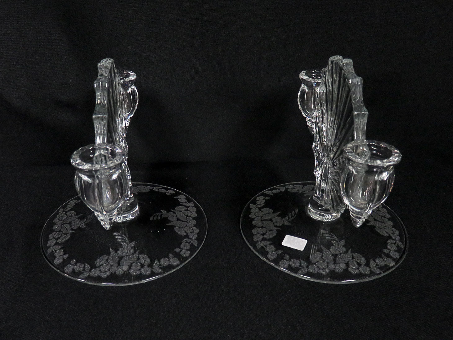 Item Number: 719-49 Set of 2, double armed candleholders with round base with etched flowers. Fan design in the middle of the holders 6.5" H