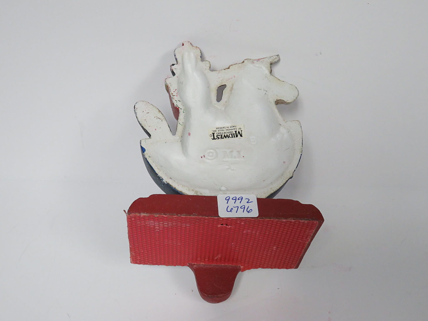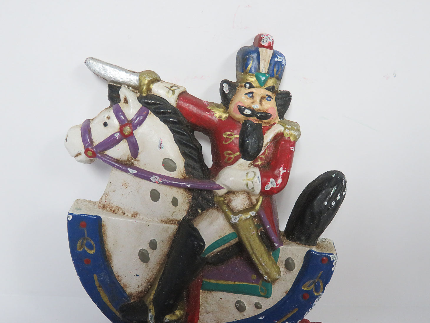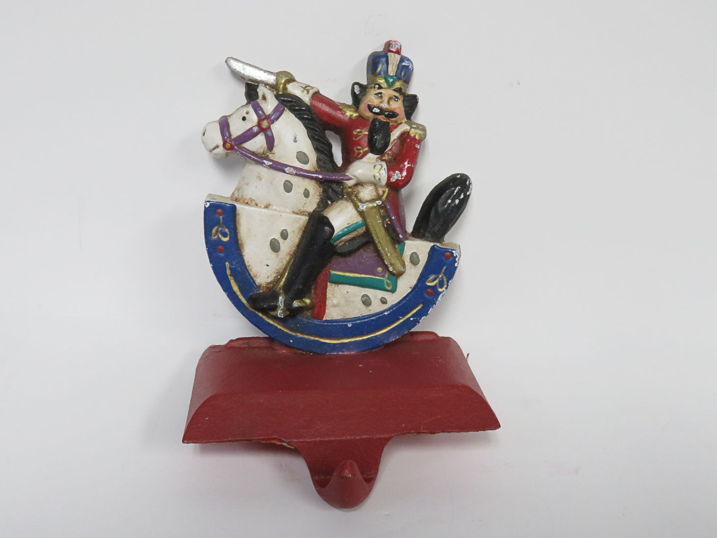 Nutcracker riding a rocking horse, red base, protective rubber on bottom 3.5" x 3" x 5.5"