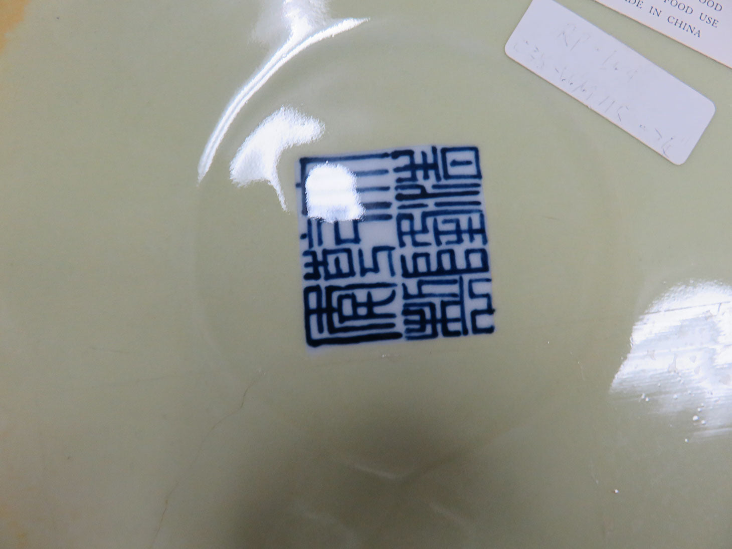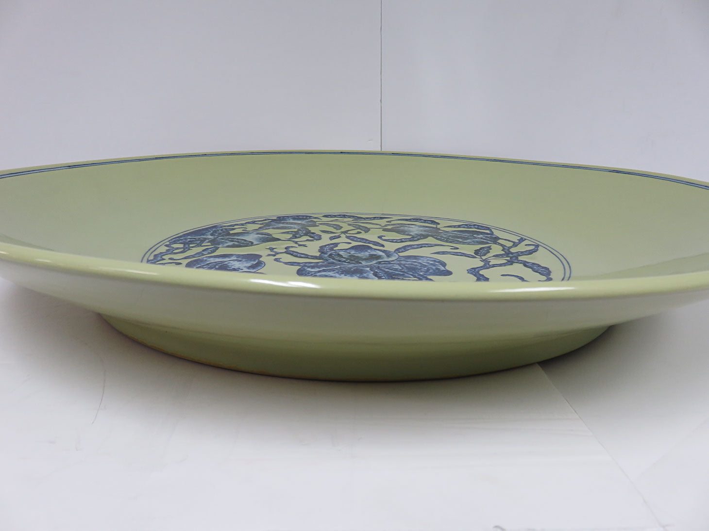 Muted green with blue peaches and stripe detail. Heavy, purchased at Merchandise Mart.