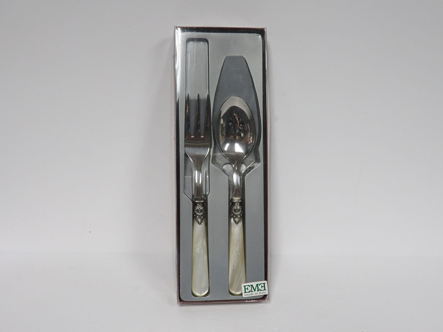 Two piece, serving fork and spoon, mother of pearl look handles, silver embellishment. Dishwasher safe.