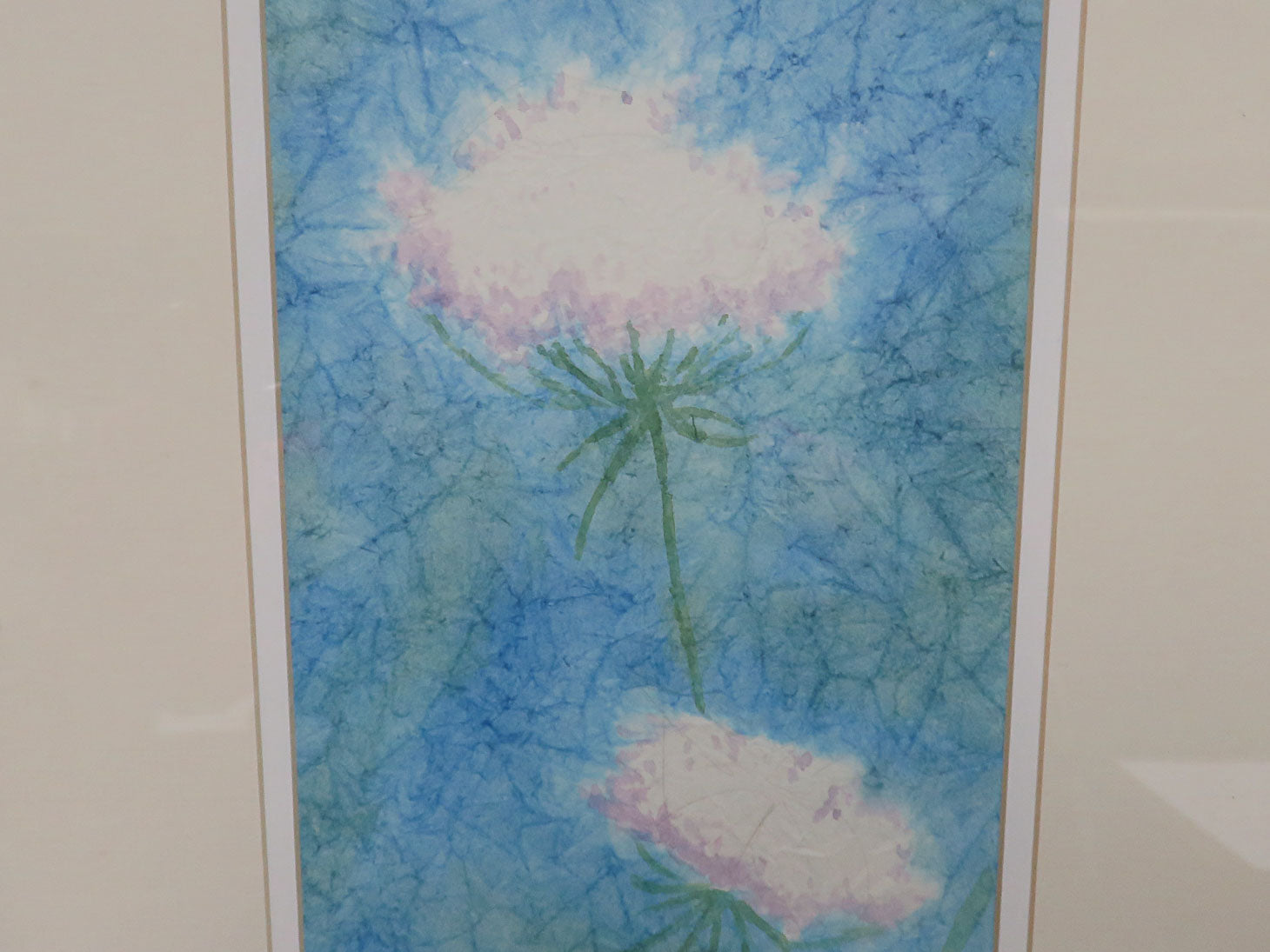 Abstract inspired 3 white flowers with blue background in a dark frame