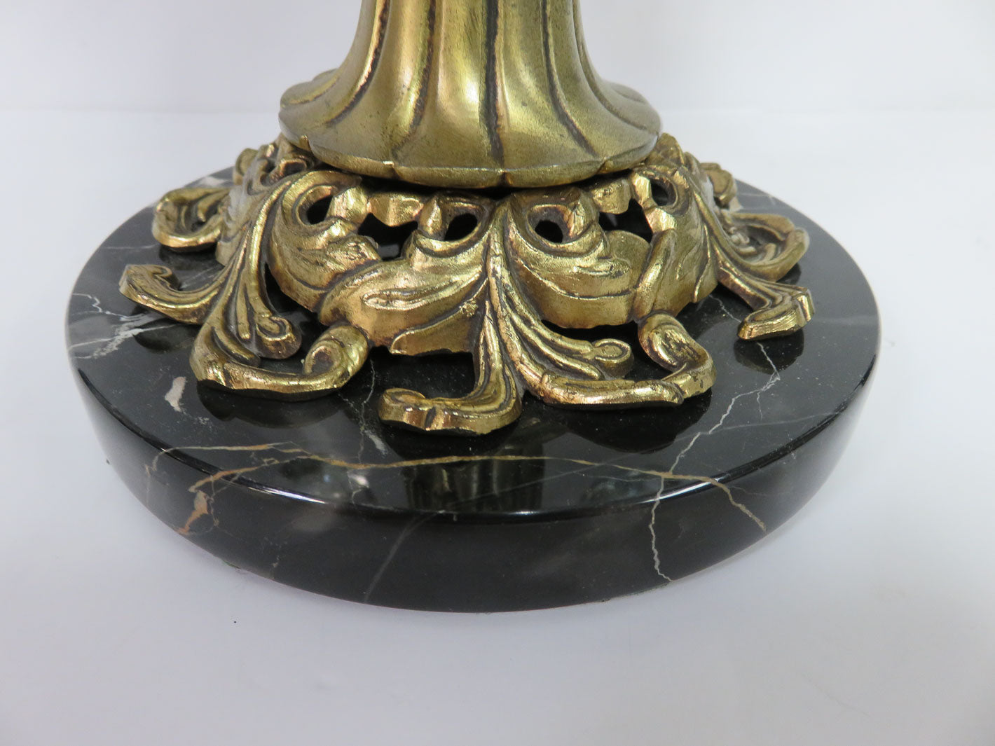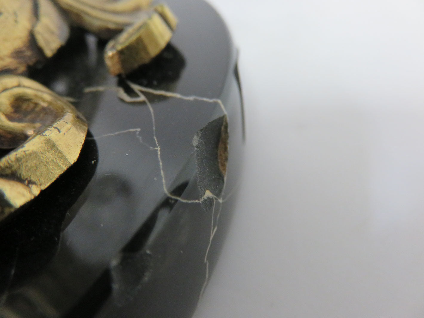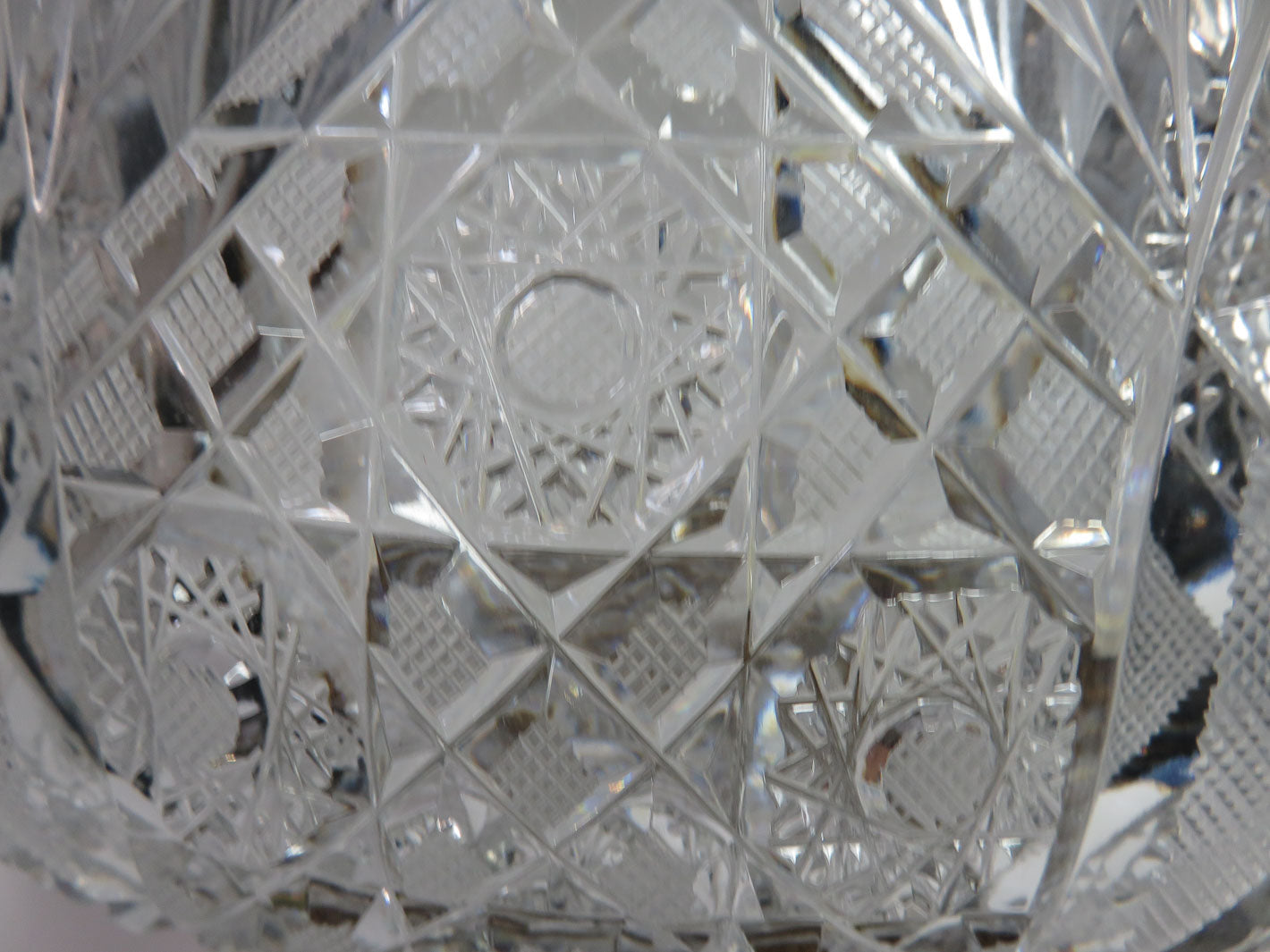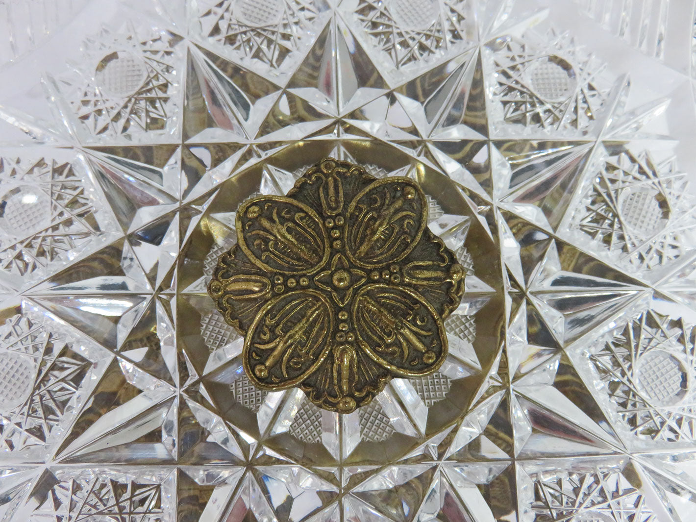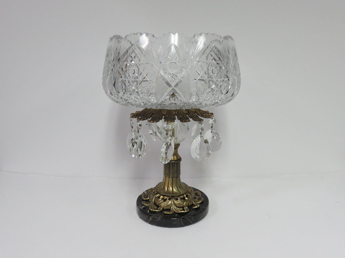 Item Number: 29350-6 Crystal compote with hob star design, 8 hanging crystal, black marble base. Tiny chip on base. 9" x 13.5"