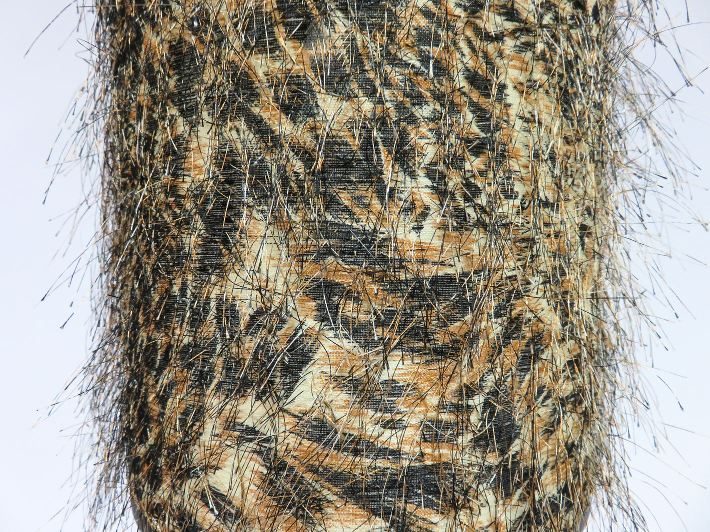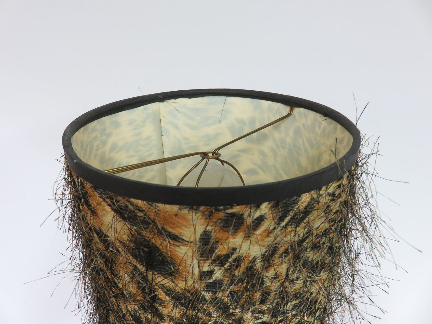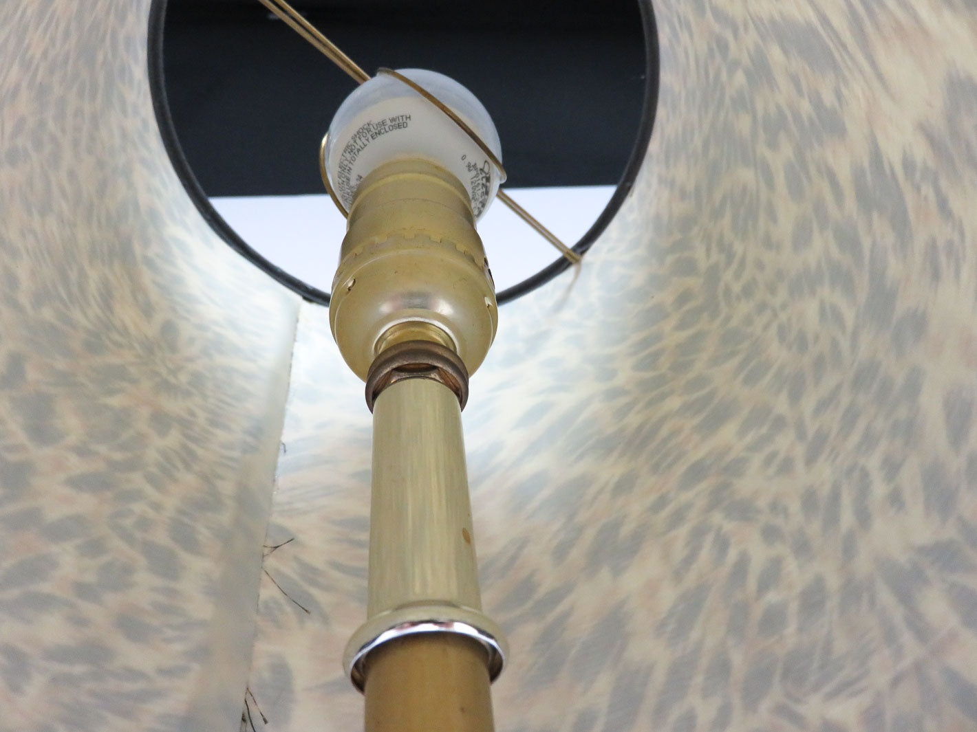 Item Number: 10853-19 Ornate round metal base with green stones and metal leaf elements below an iridescent multicolored orb. Leopard print lampshade with fringe elements 23.5" H