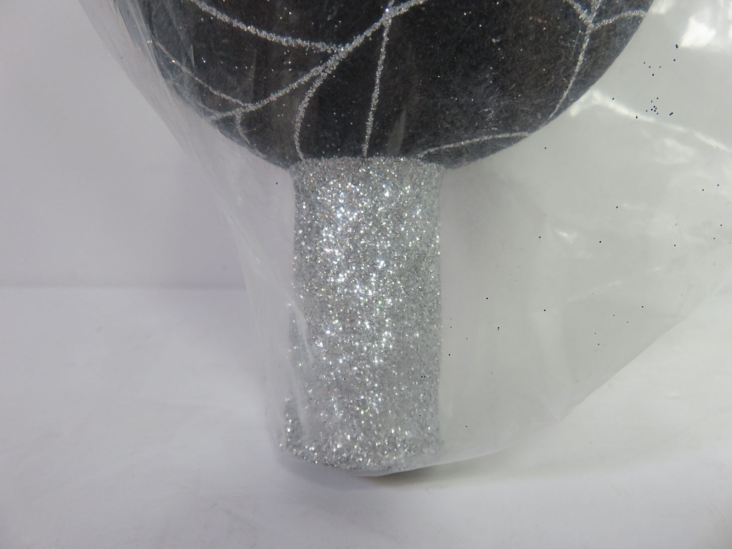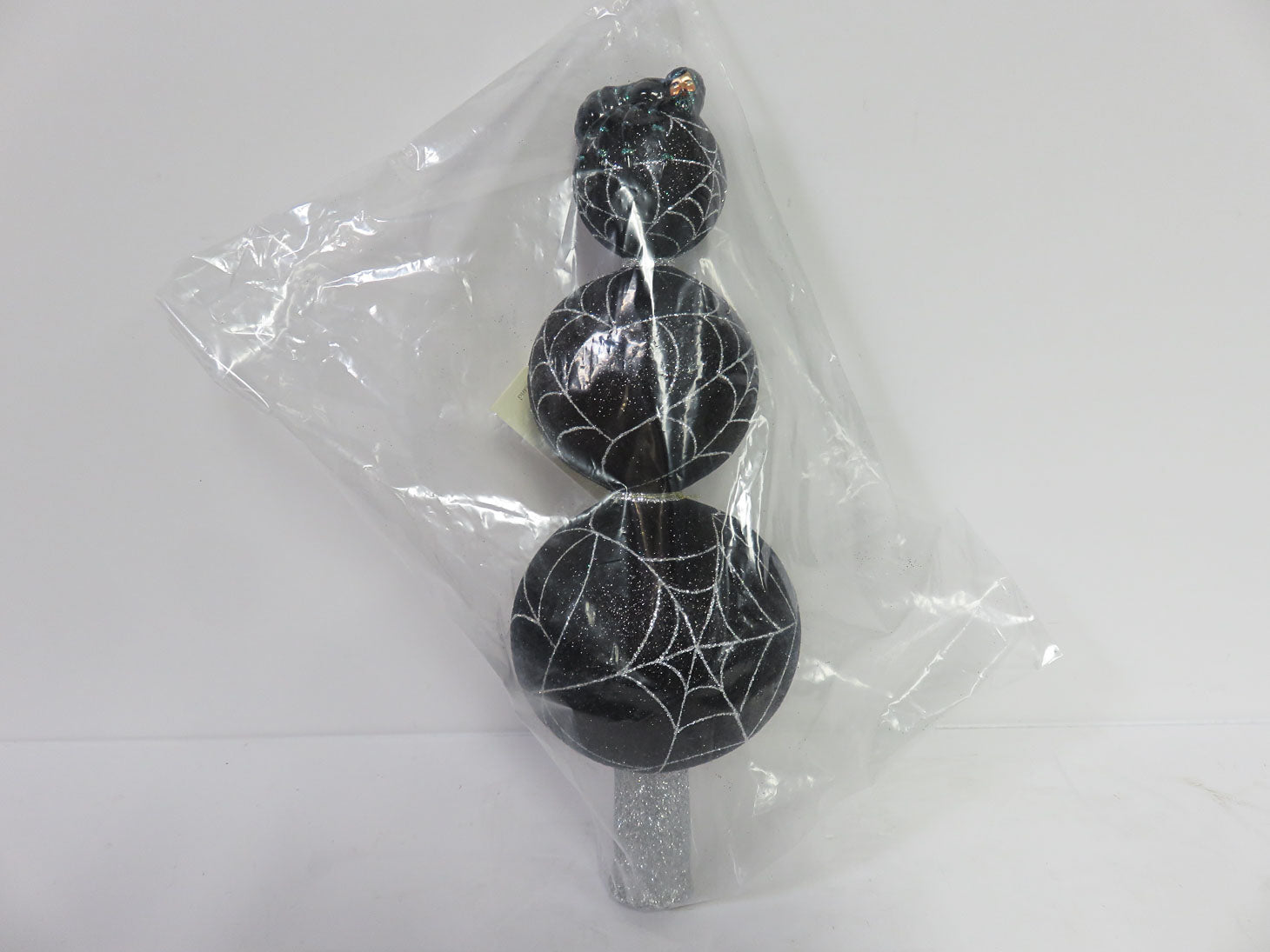 "Web Master Finial" Stacked black spheres with silver spider webs