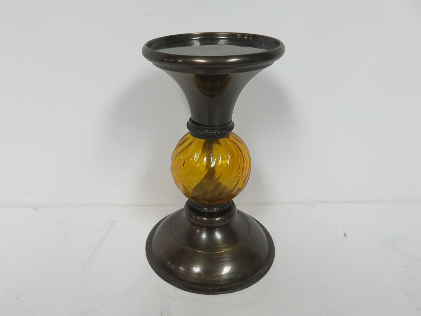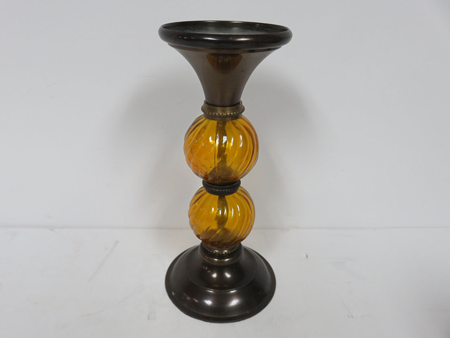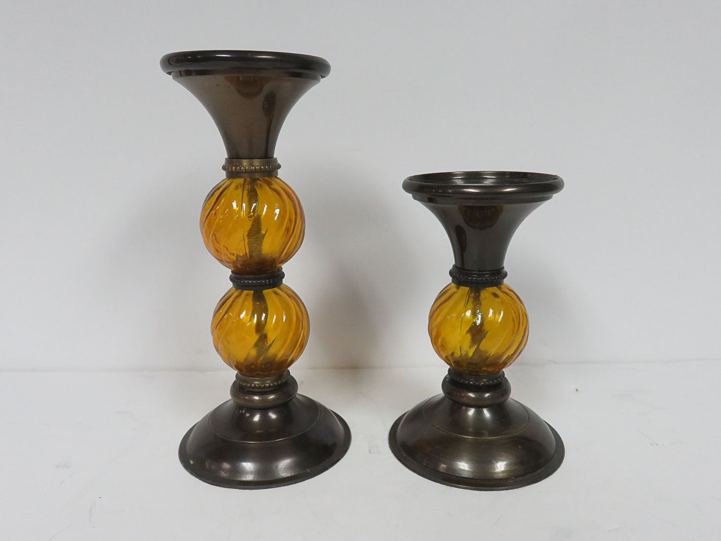 Set of 2, brown metal base and top, amber swirl orbs