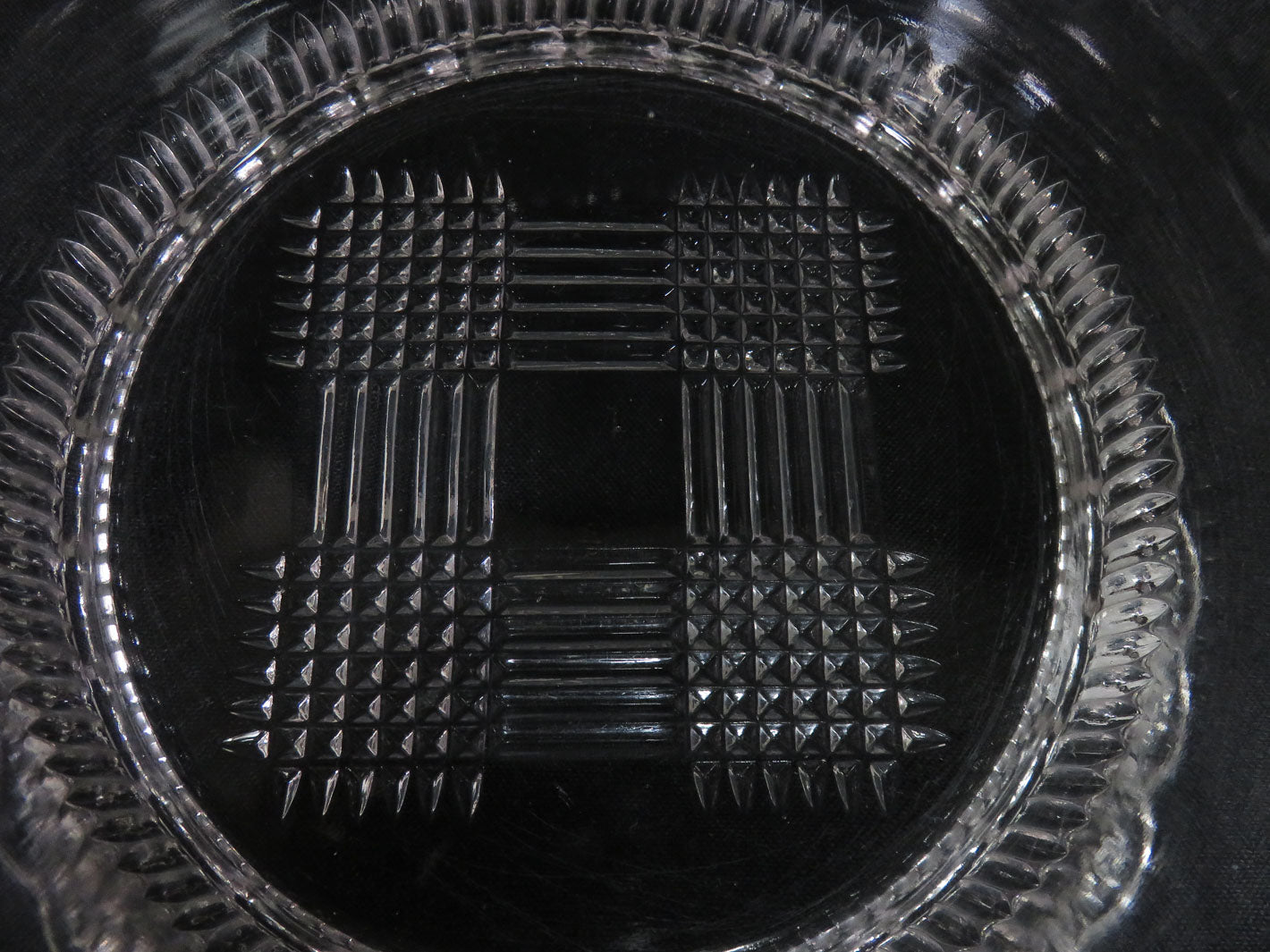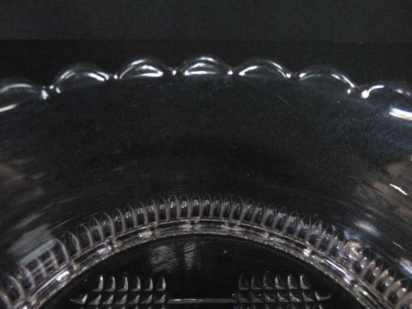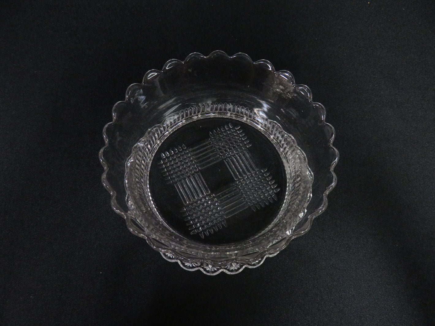 Scalloped rim and base, clear, crisscross pattern base, slighted tinted