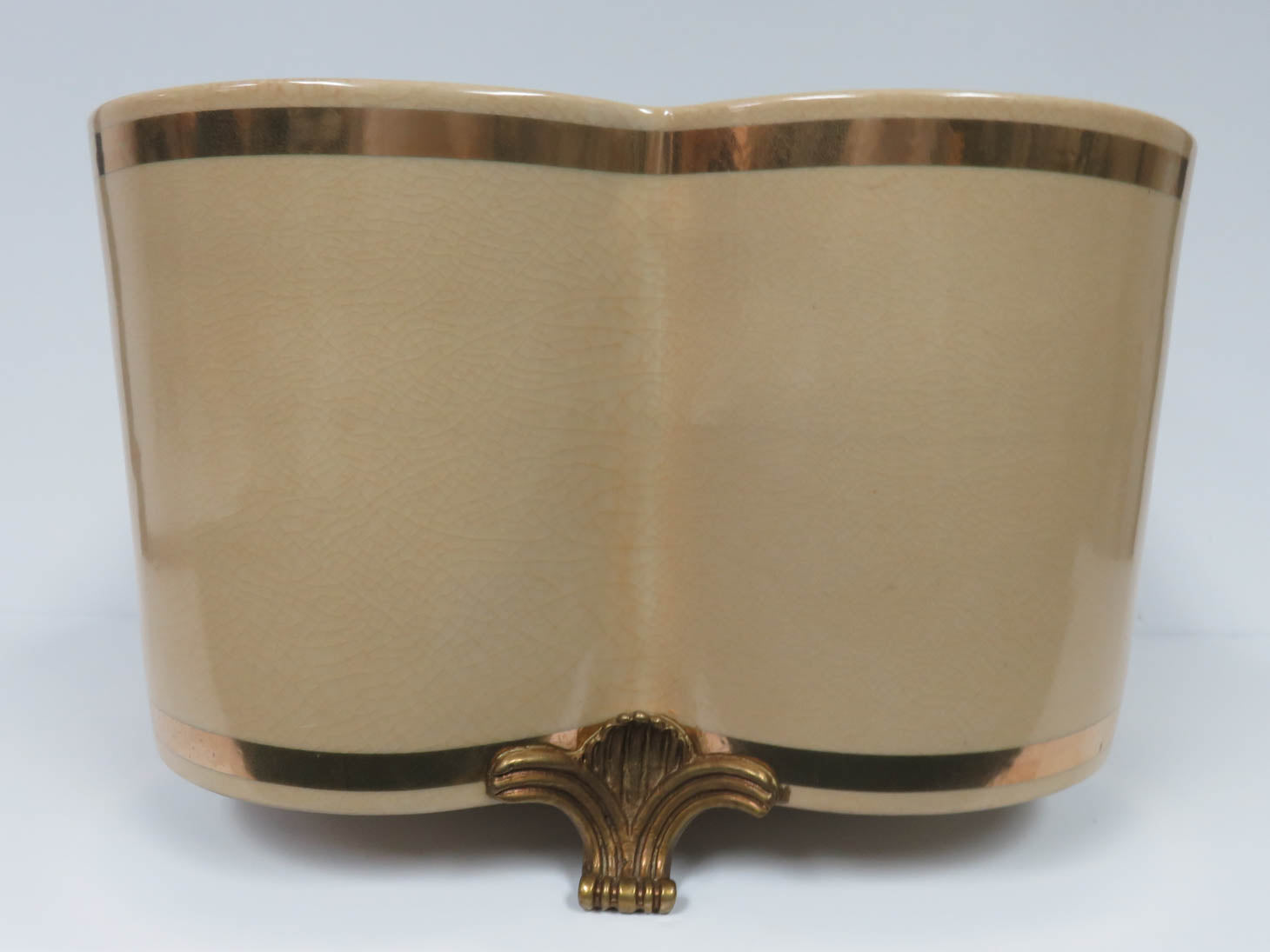Item Number: 18214-23 "Port 68" cream with gold band and ornate brass feet, holds 4 6" pots 12.5" x 12.5" x 8"