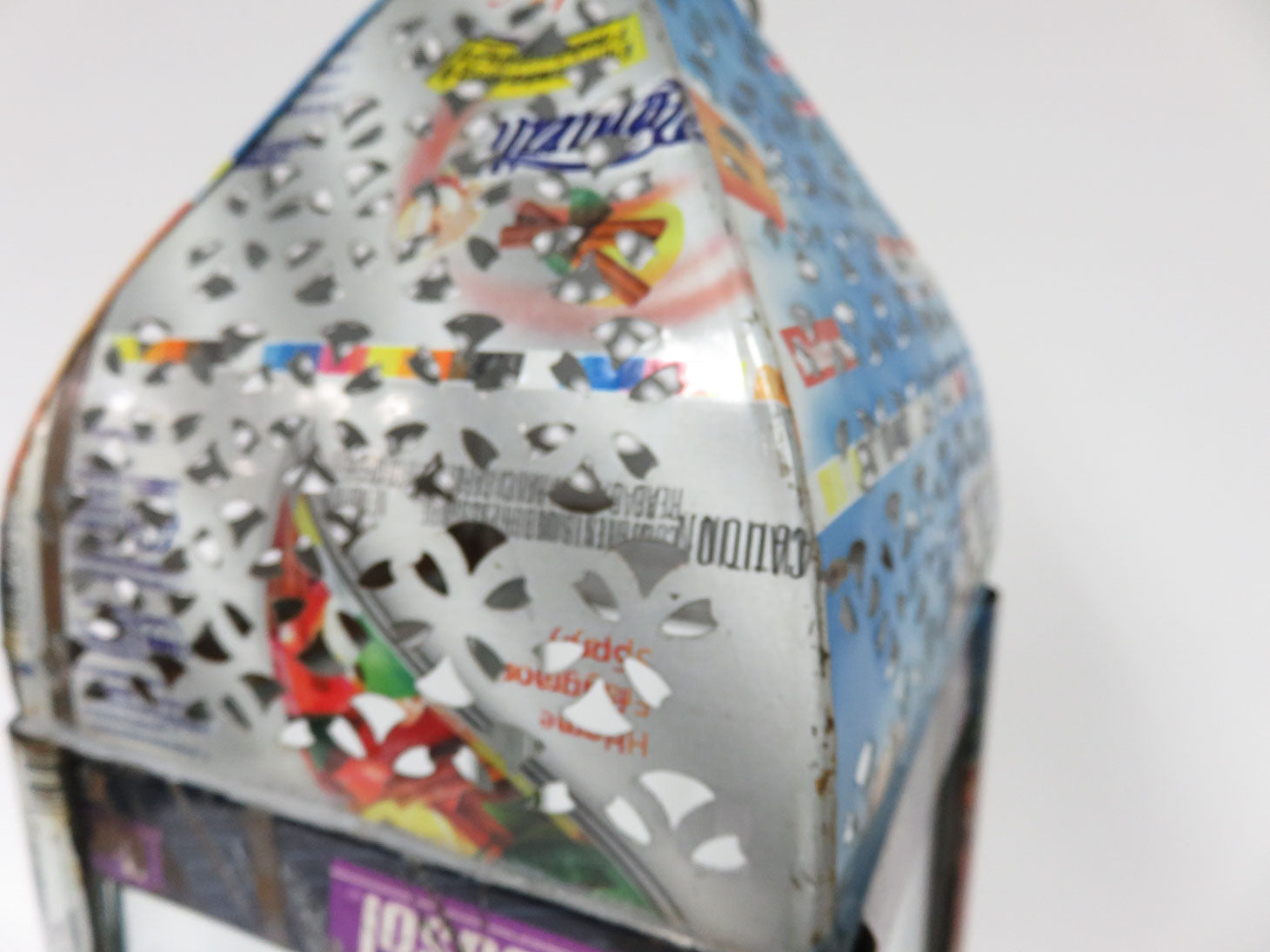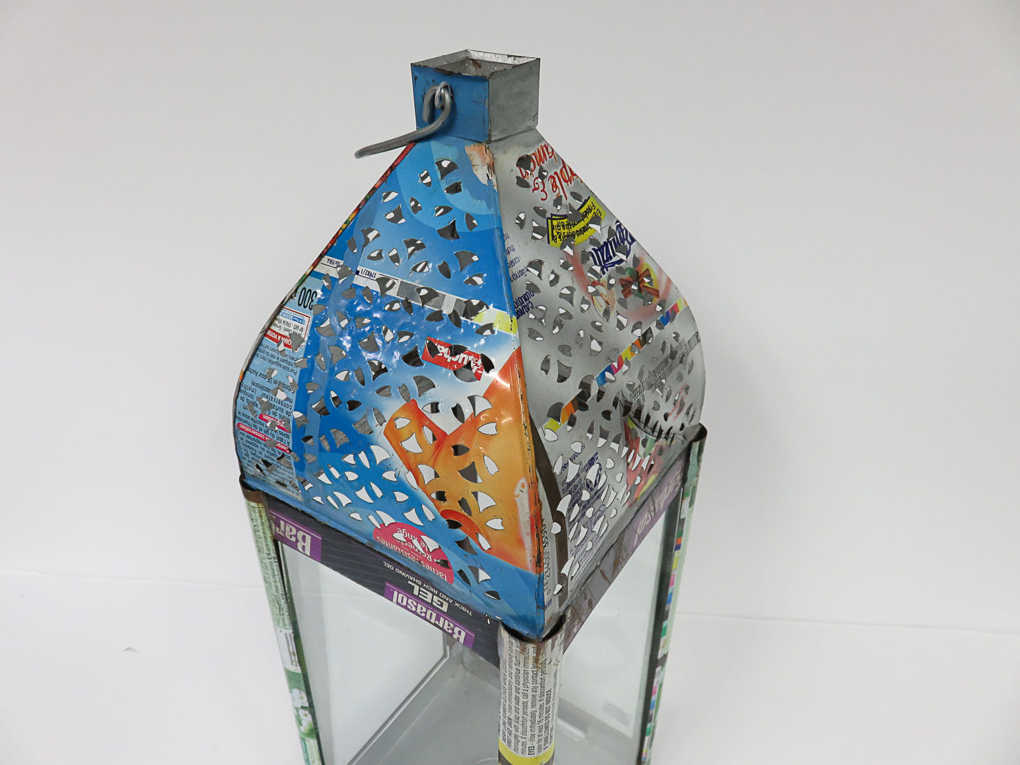Pierced metal, glass panes, holds tea light, hinged door, handle