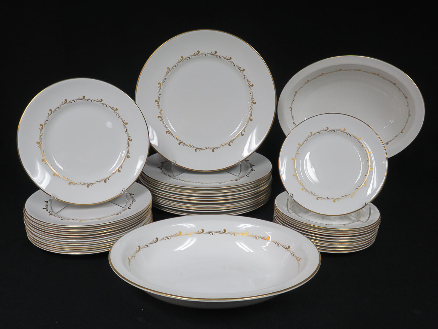 "Rondo" pattern. Cream with gold accents 10 dinner, 10 salad, 10 bread and butter with 2 oval serving bowl. 32 pc