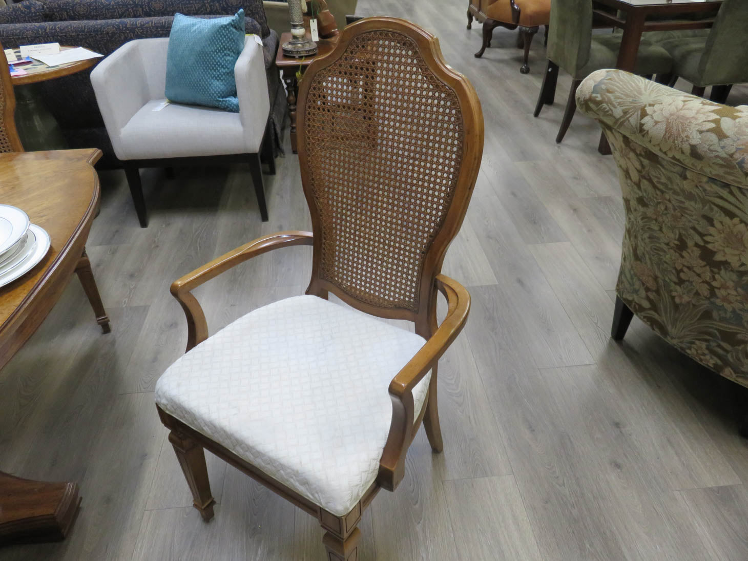 Two three-footed fluted pedestals and 16" leaves. Cane backed chairs with cream upholstery on seats.