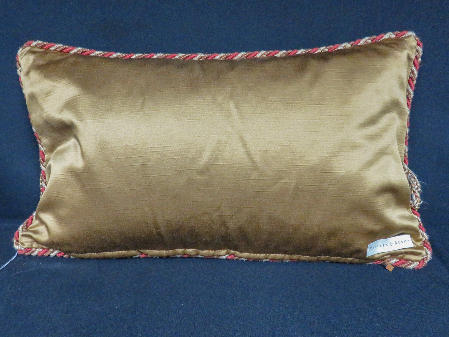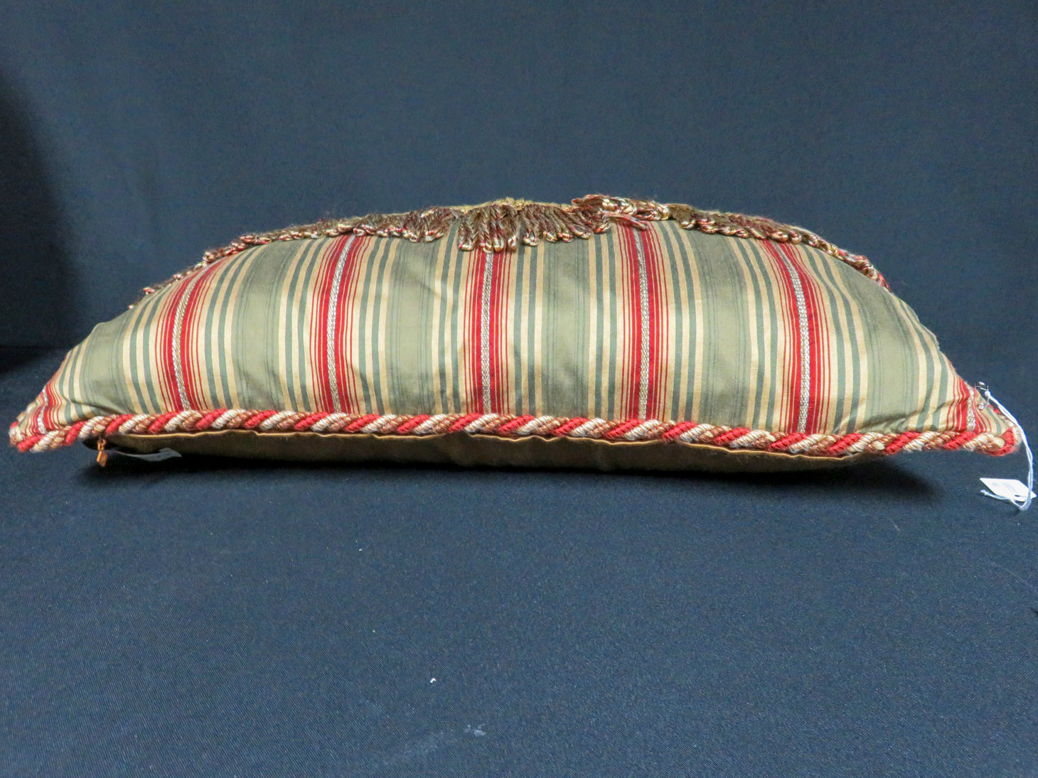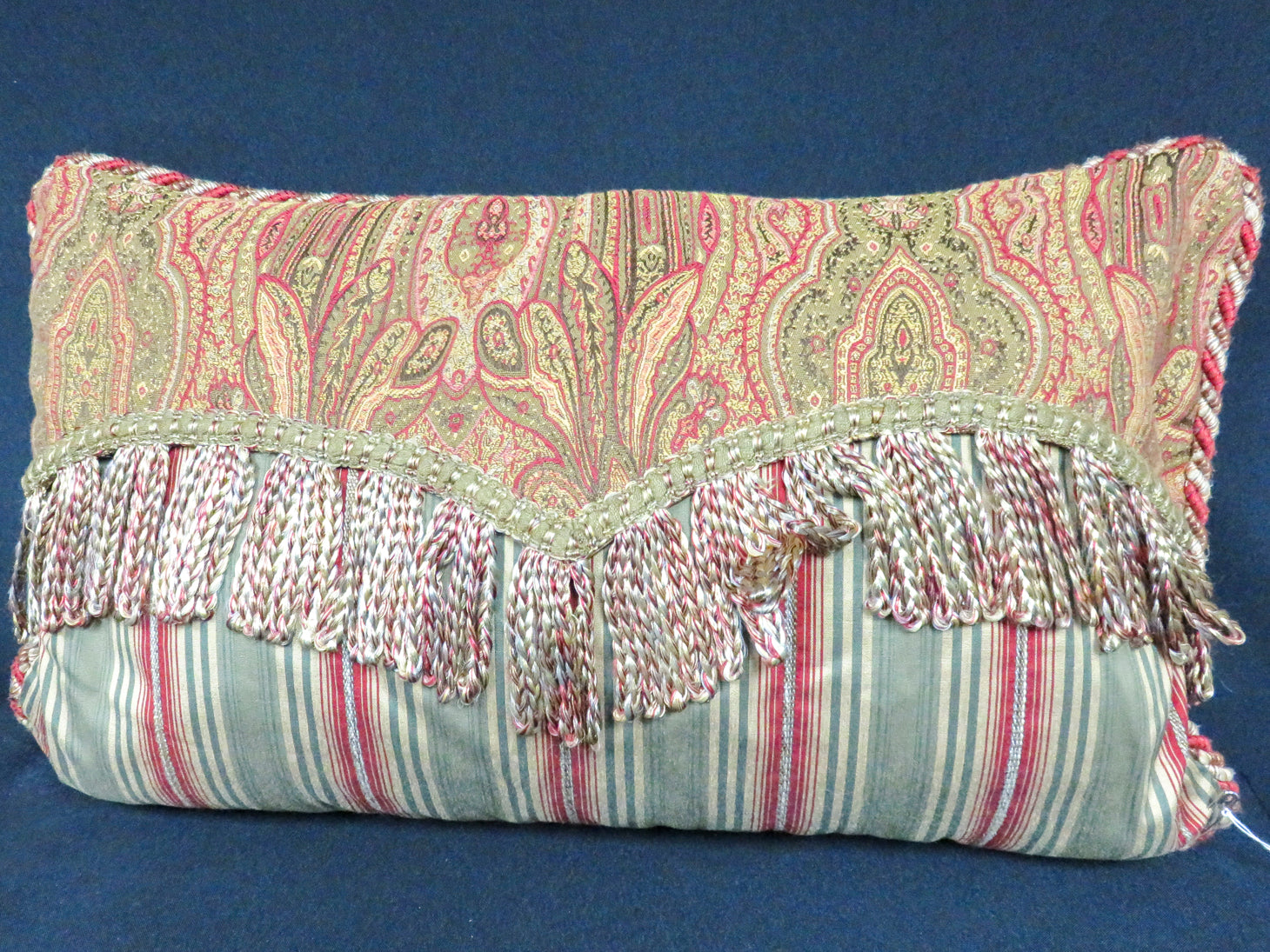 Red and olive green with fringed decorative accents. Twisted edging is red and gold.