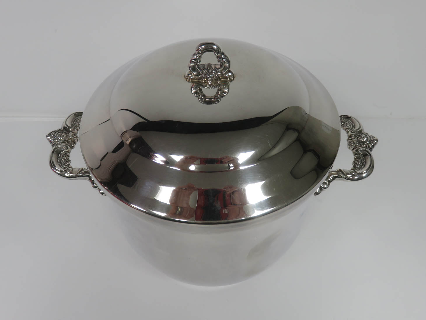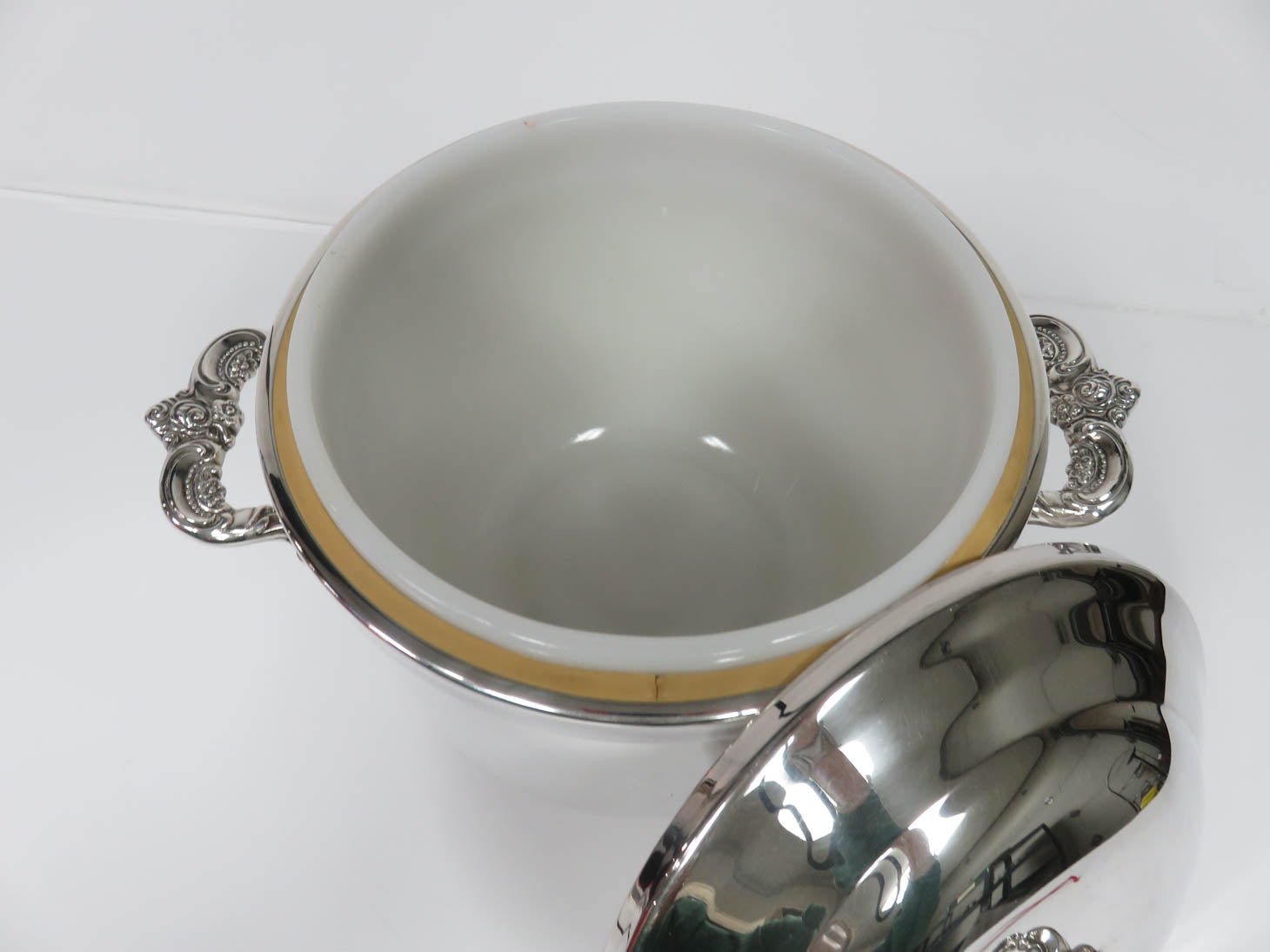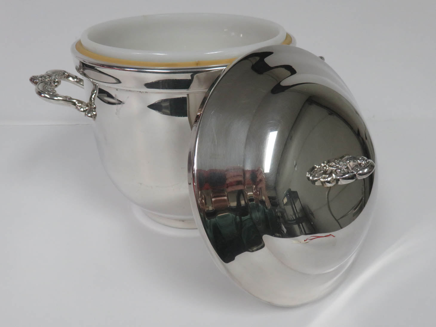Silverplate with white glass interior, ornate handles, 2 pieces