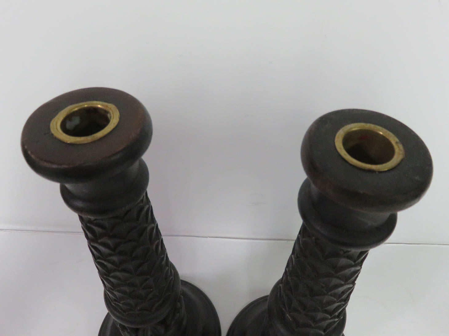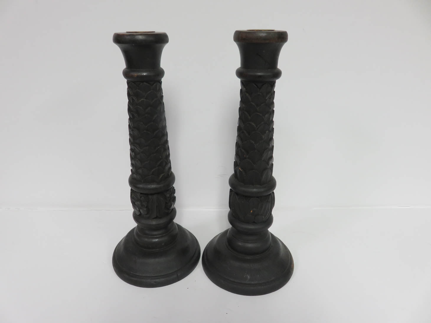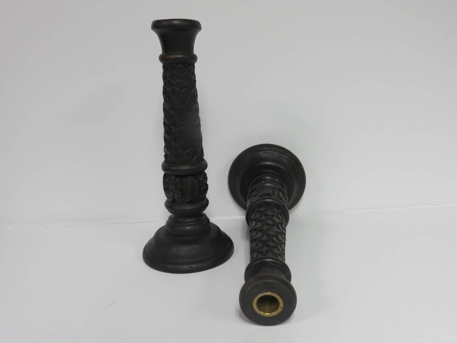 Pair of dark wood candlestick, round base, leaf and floral design, metal interior cup 12" H