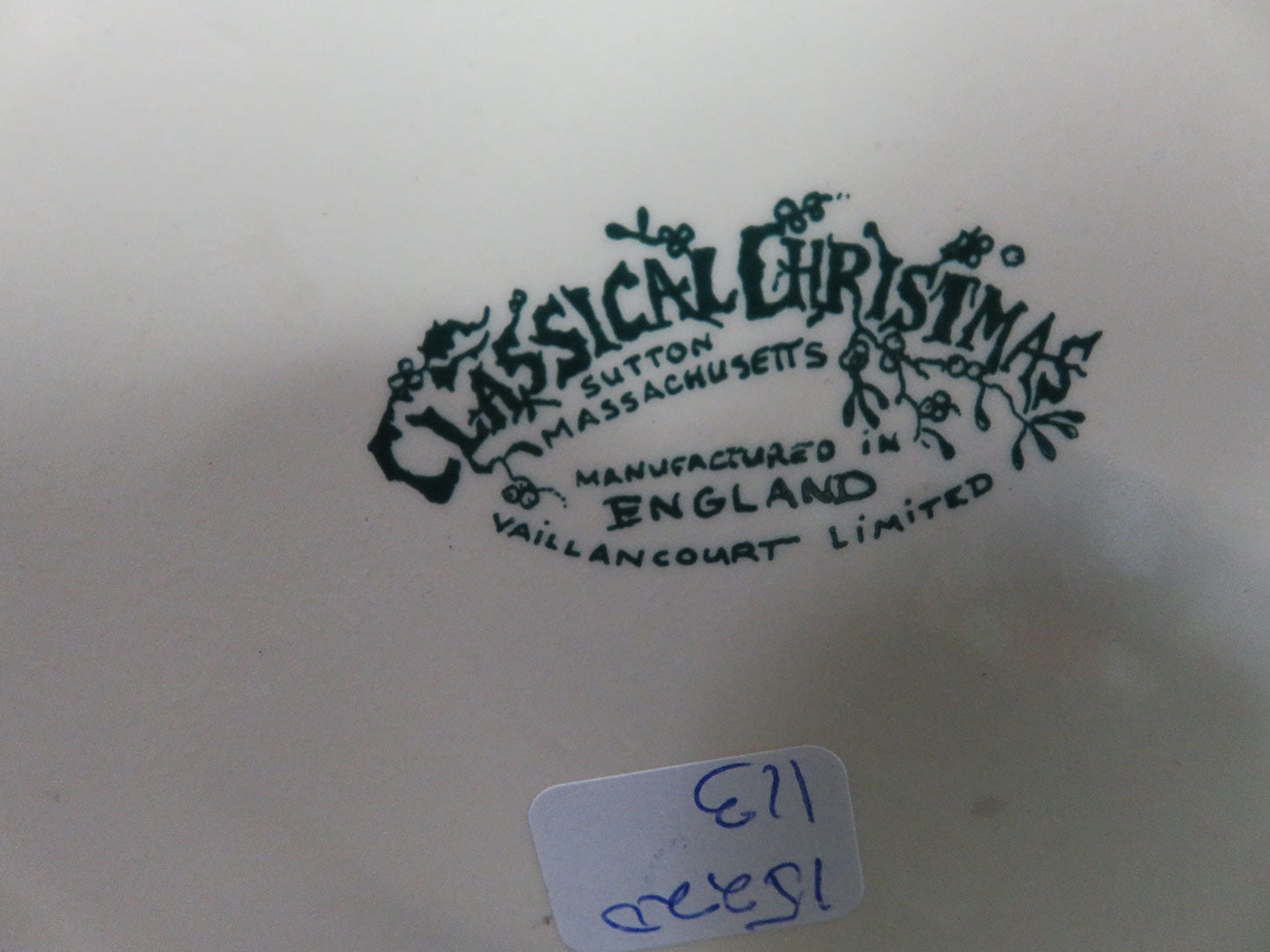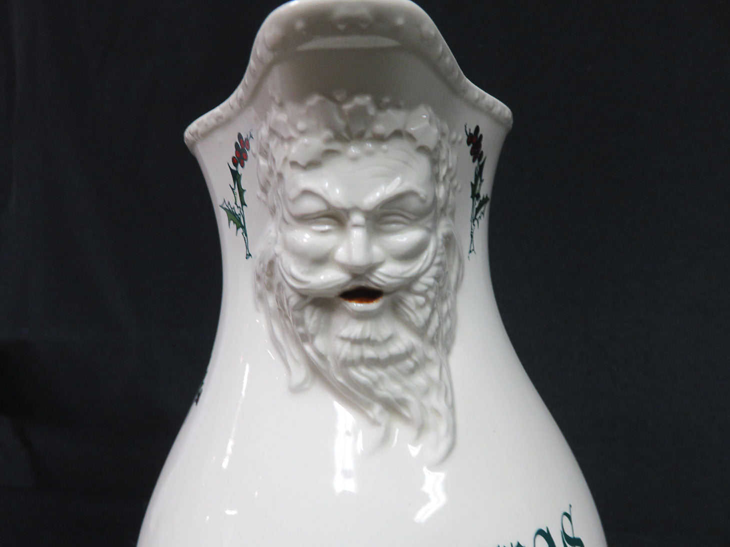 "Classic Christmas", cream with holly berry, embossed Santa under lip, applied double ridge handle 8.5"H