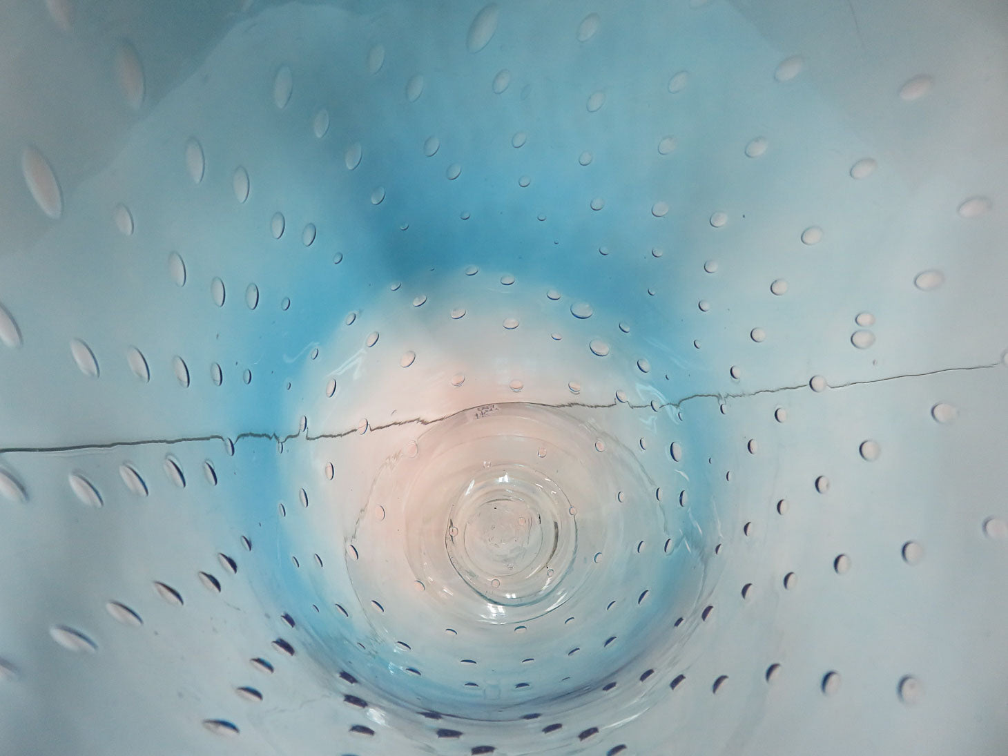 Ocean blue vase with controlled bubbles on clear glass circular base