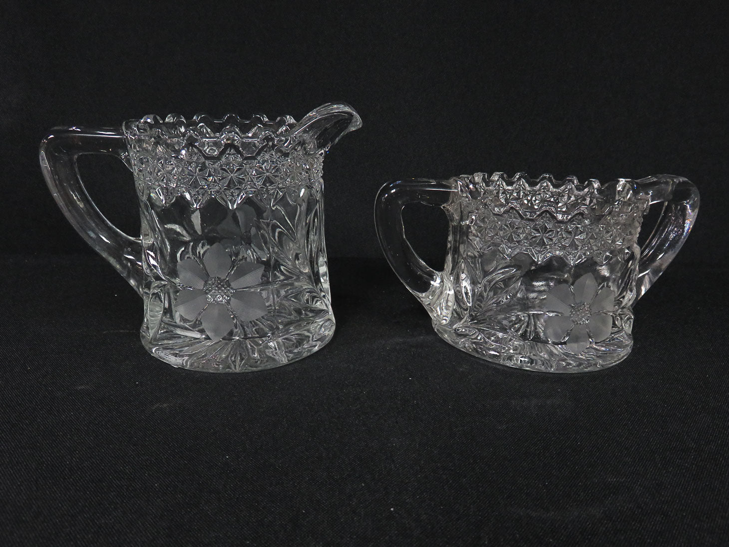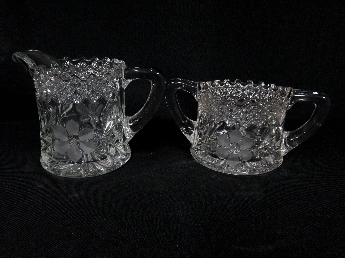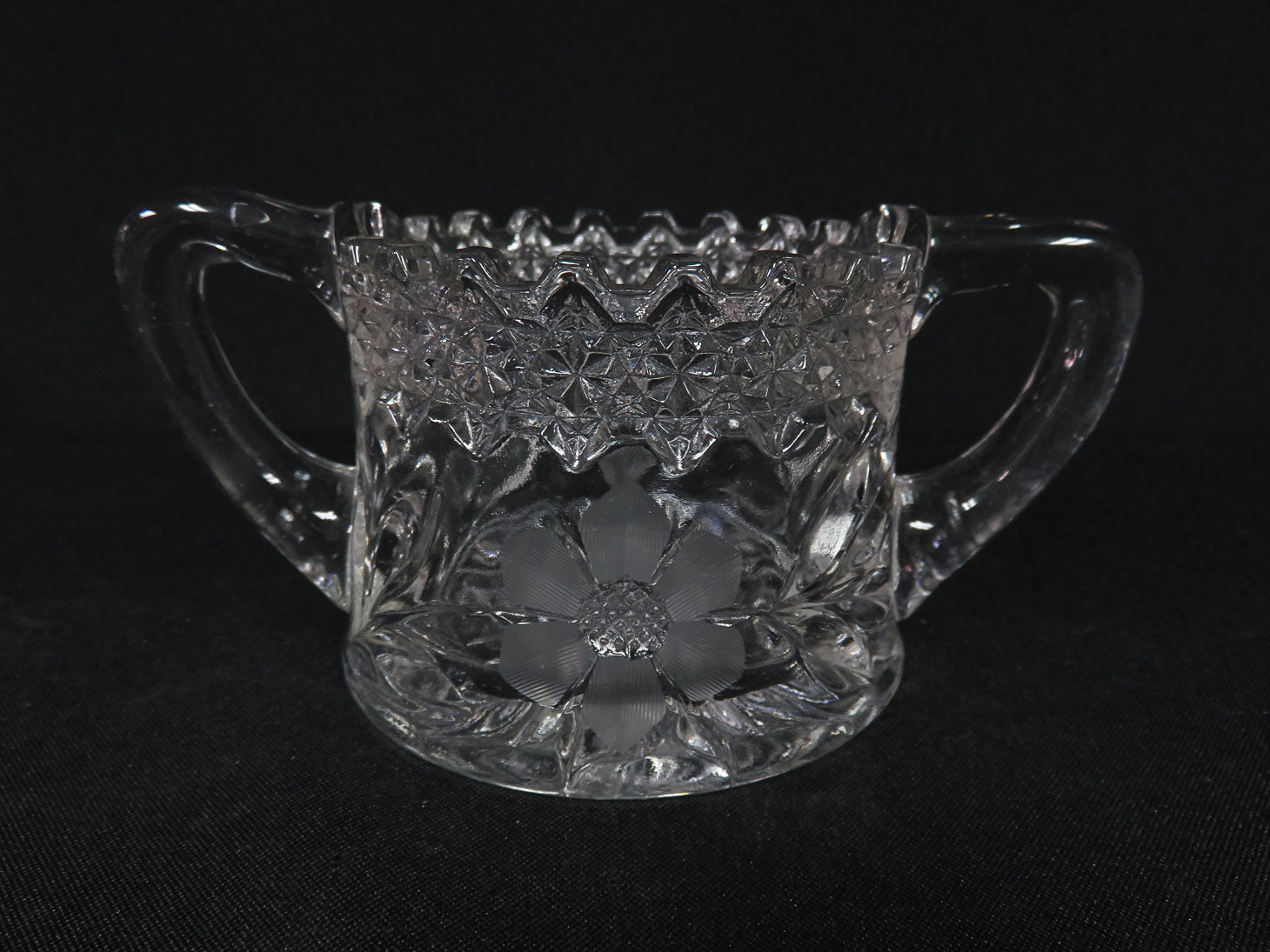 Sawtooth rim, frosted etched flowers, open sugar with two handles