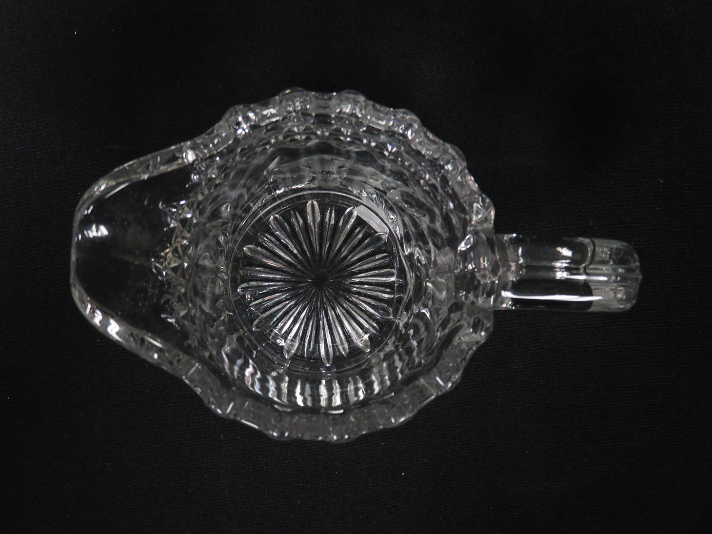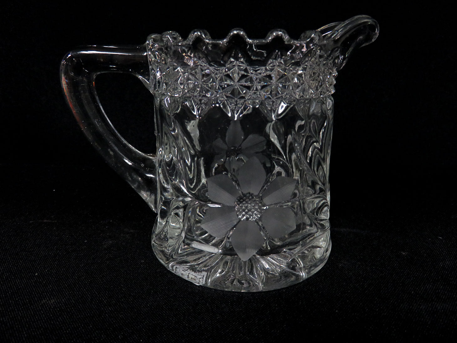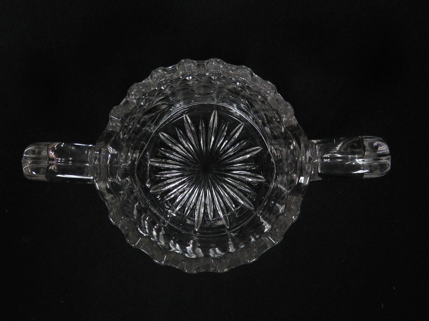 Sawtooth rim, frosted etched flowers, open sugar with two handles