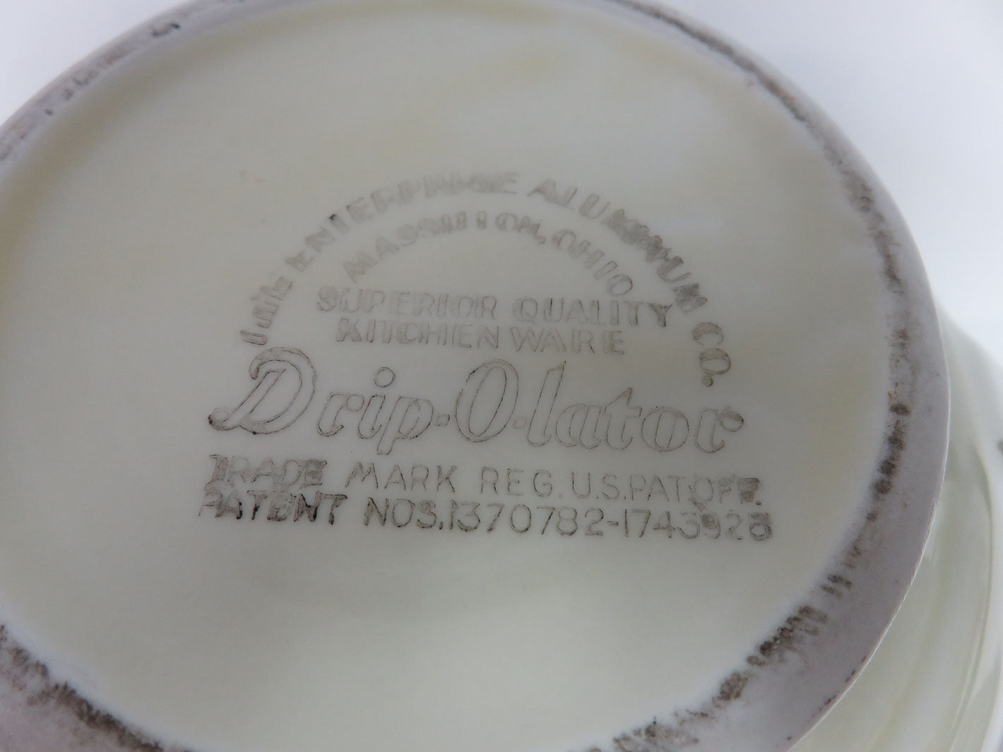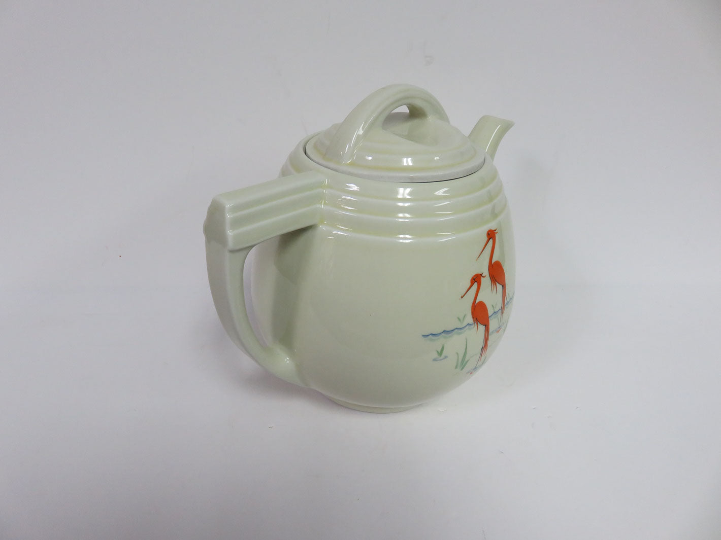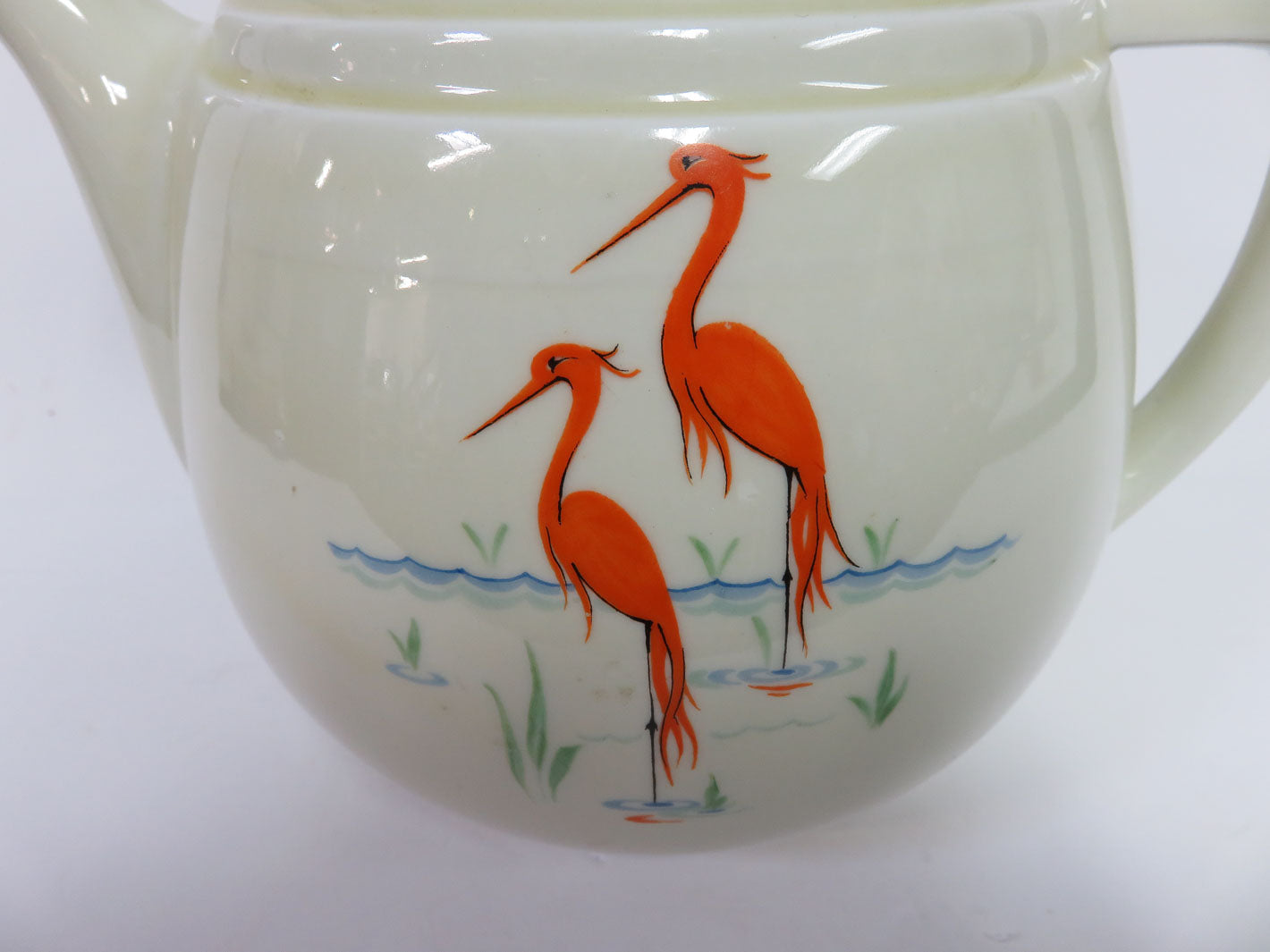 Drip-o-Lator teapot with "Crane" pattern on a cream background
