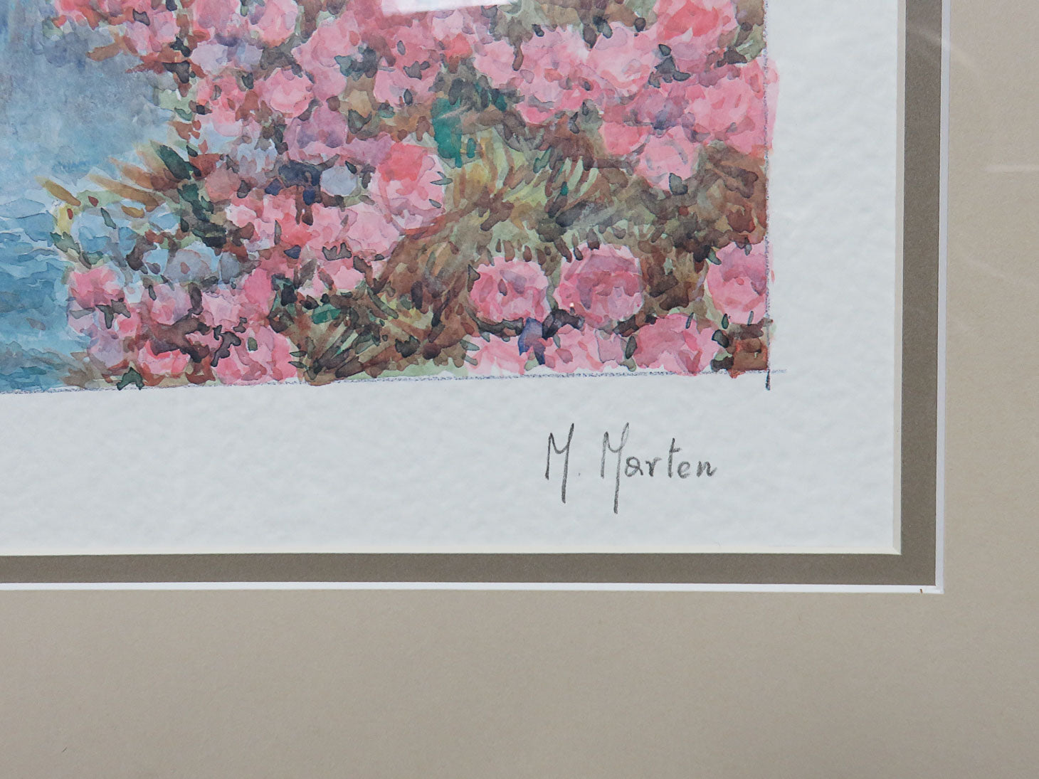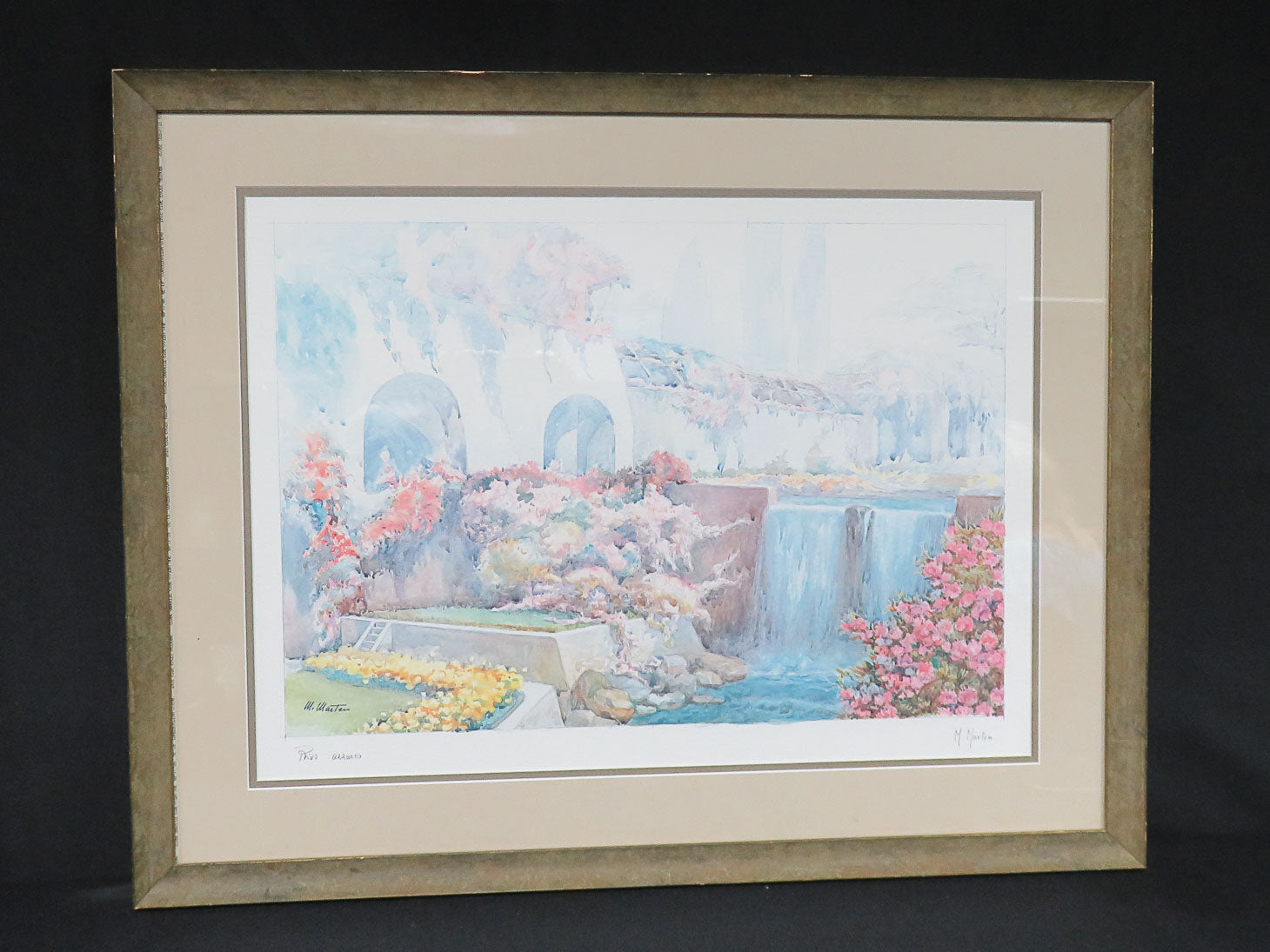 Item Number: 20704-8 Yellow and pink garden with waterfall by M. Marten in modeled tan color frame 30" x 24"
