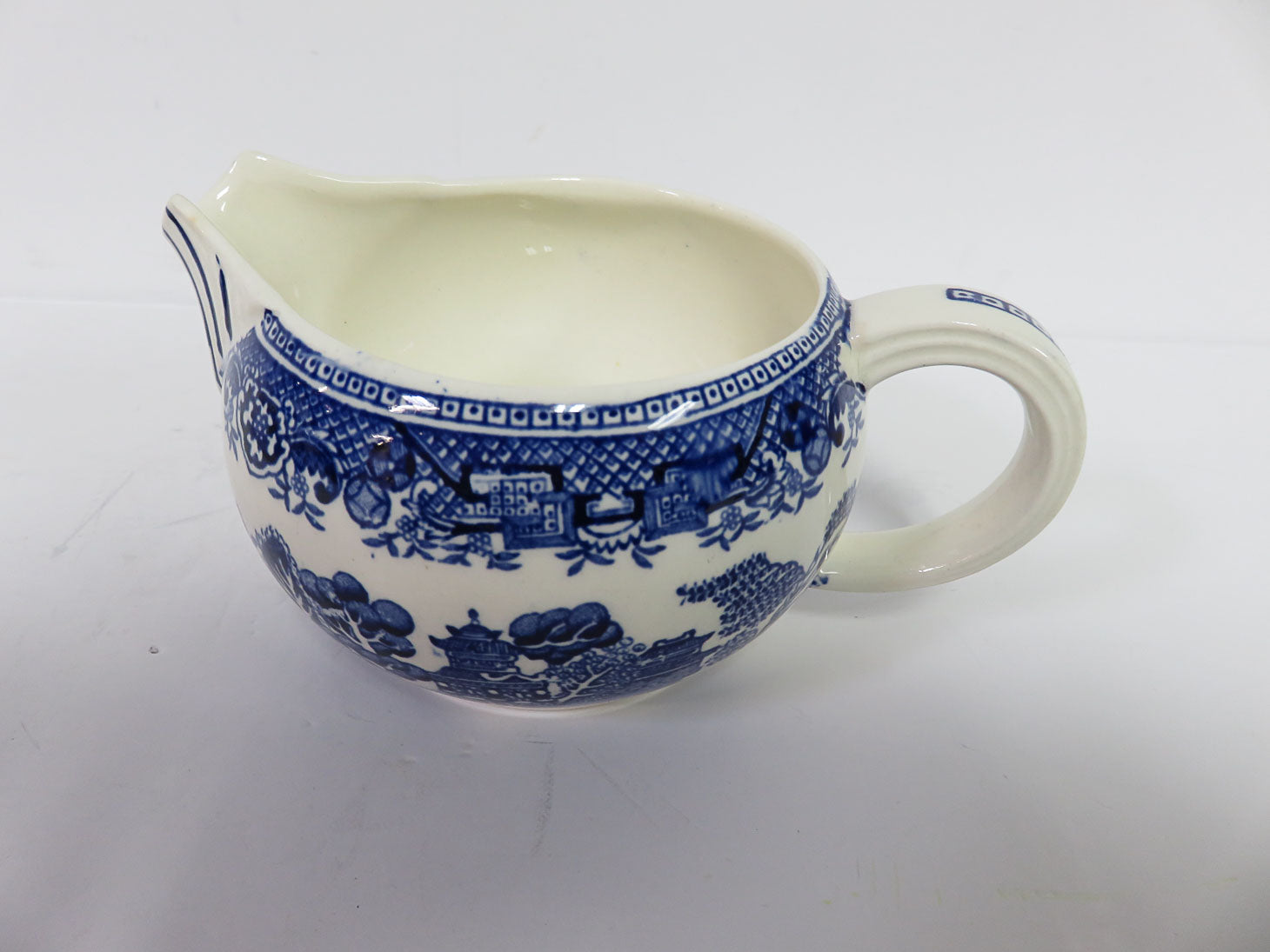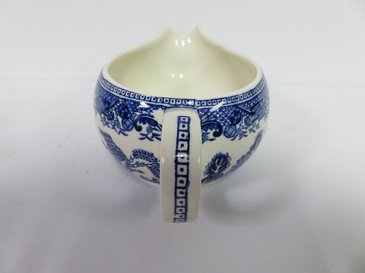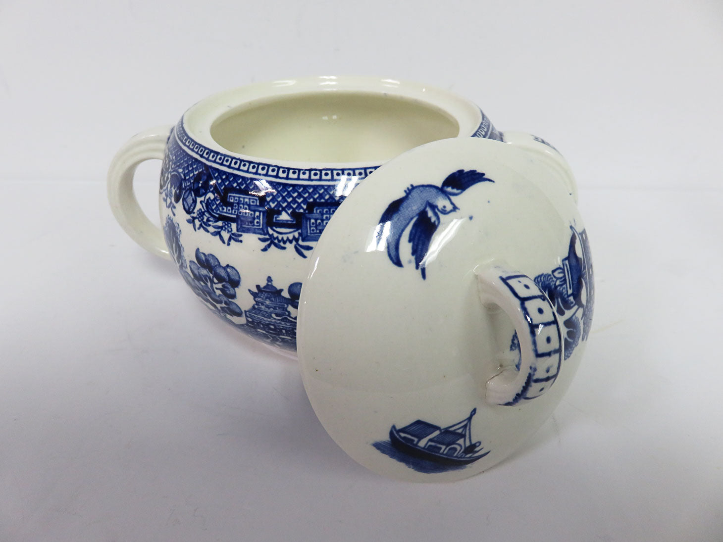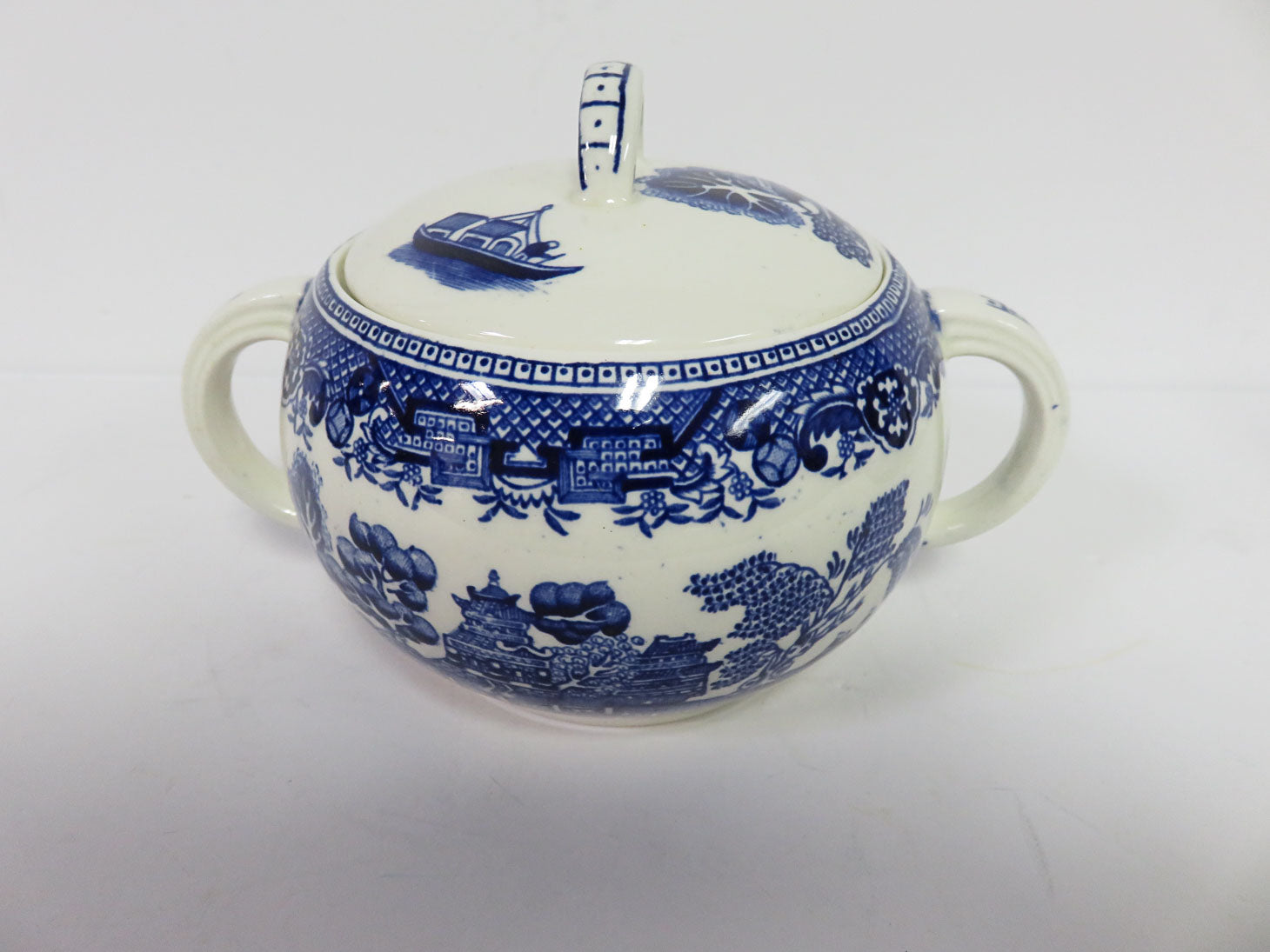 Item Number: 6459-132 "Blue Willow", white and cobalt transferware, covered sugar two handles, 3 pc Sugar: 4" H