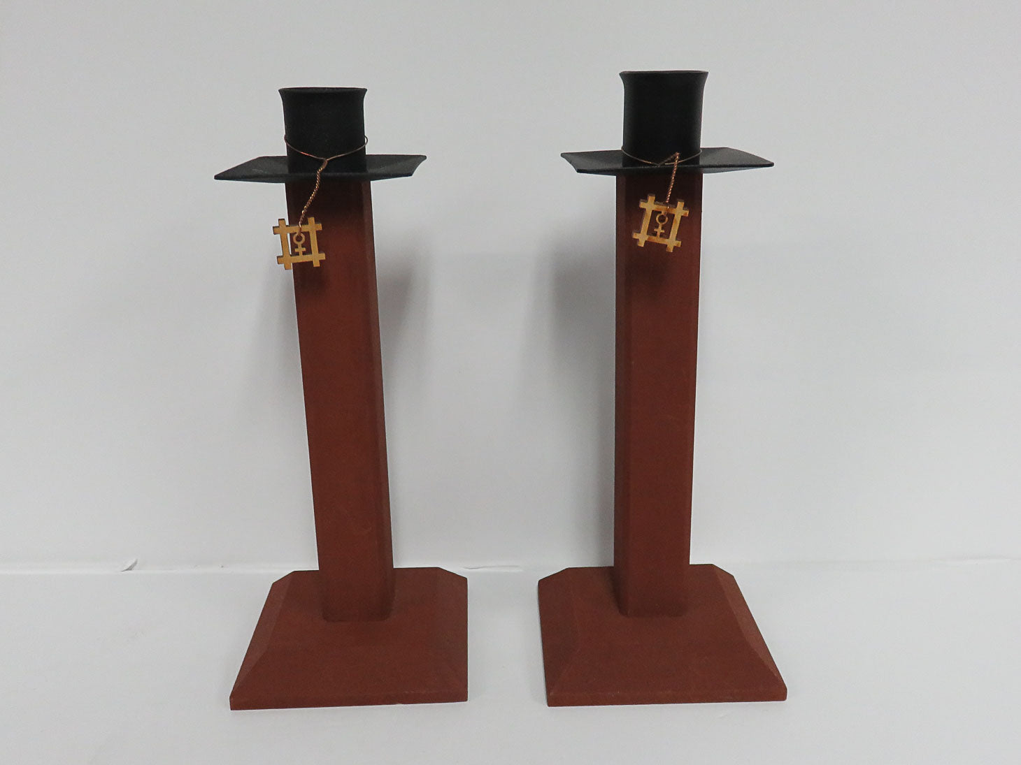 Pair, Copper-color wood base with metal holder and wood charms on copper wire