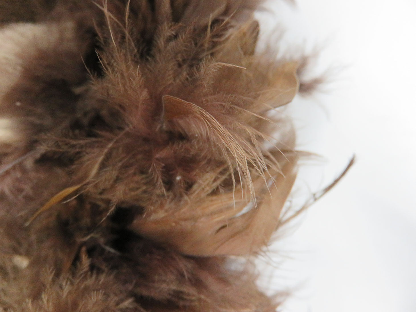 Item Number: 2479-27 Brown and cream with brown feather trim. Marlo Lorenz, Poly filled. Two available, sold separately #2479-26. 21" x 21" counting feathers