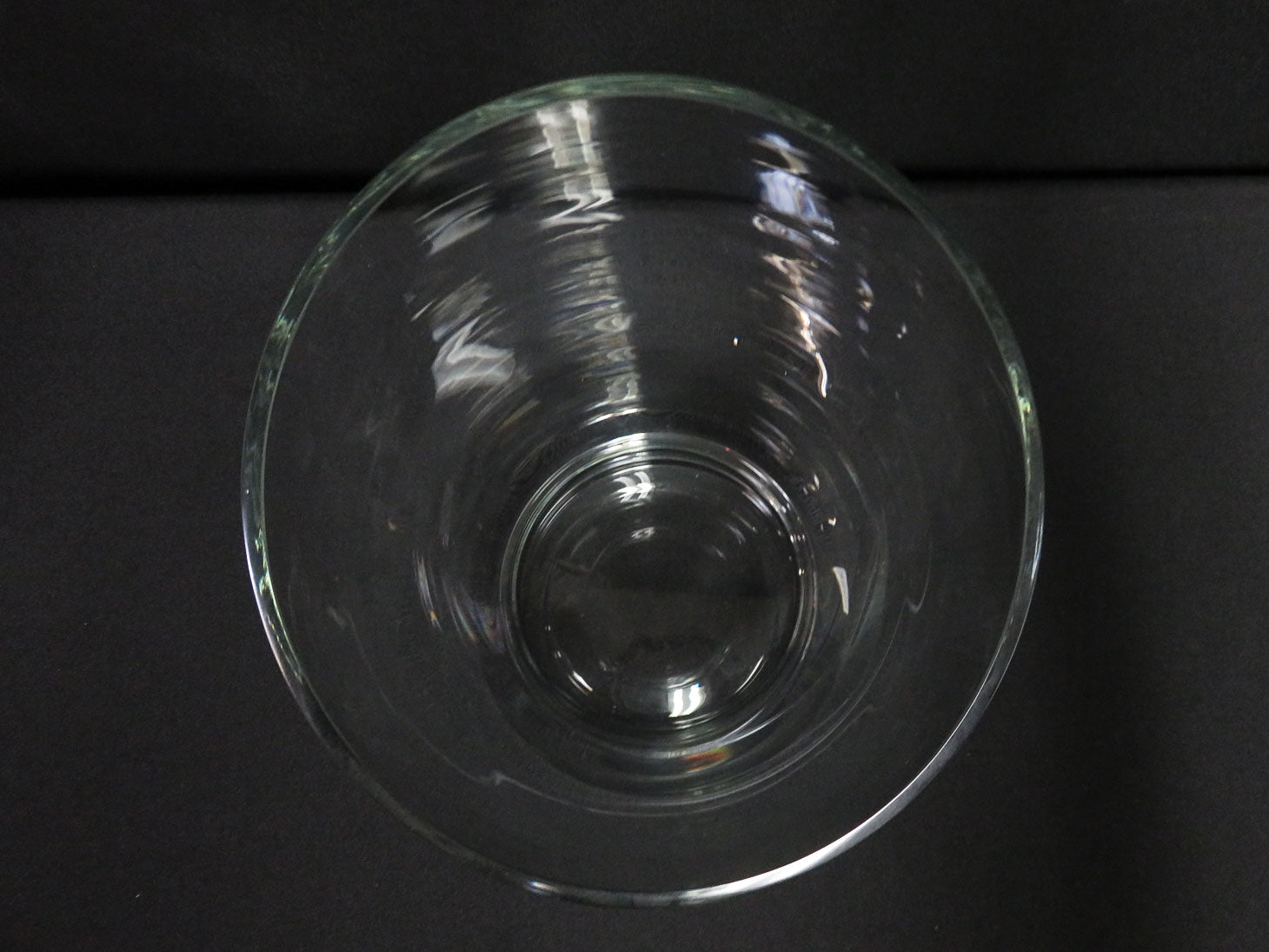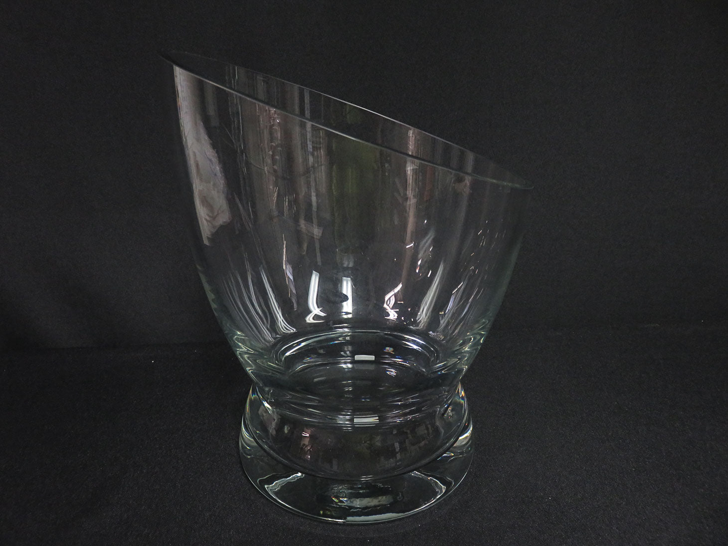 Clear, heavy base, slanted opening, pinched middle