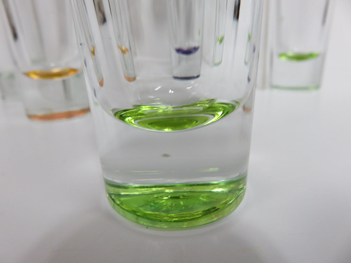 Set of 8, Clear cylinder shape with assorted colors in base.
